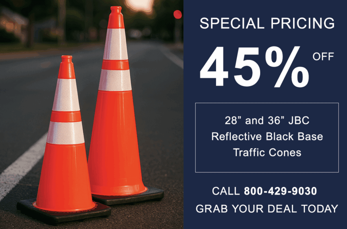 Limited-time pricing on JBC 28″ (7 lb) and 36″ (10 lb) orange cones with reflective collars.