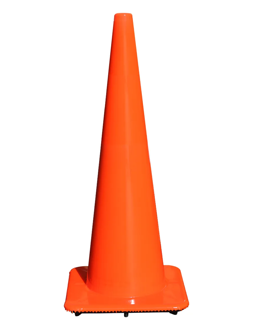 Our 36 inch Traffic Cones are designed for road work and come in Brilliant Fluorescent Orange or Lime with UV inhibitors. These road cones are 100% PVC flow-molded traffic cones with a "one piece design" which means no seams to split or tear. The Flow Molded design provides superior flexibility in heat and cold - our 36" traffic cones bounce back from an impact. With 15"x15" cleated bases that grip the road and a wide body design to ensure stability, these traffic cones increase driver & pedestrian awareness around work zones and on the road. The Orange color is available in both 10lb and 12lb weights. 36" flow molded orange and lime traffic cones are available with optional 6" and 4" high-intensity reflective collars. Optional custom lettering and logos available. In Stock for Immediate Shipment.