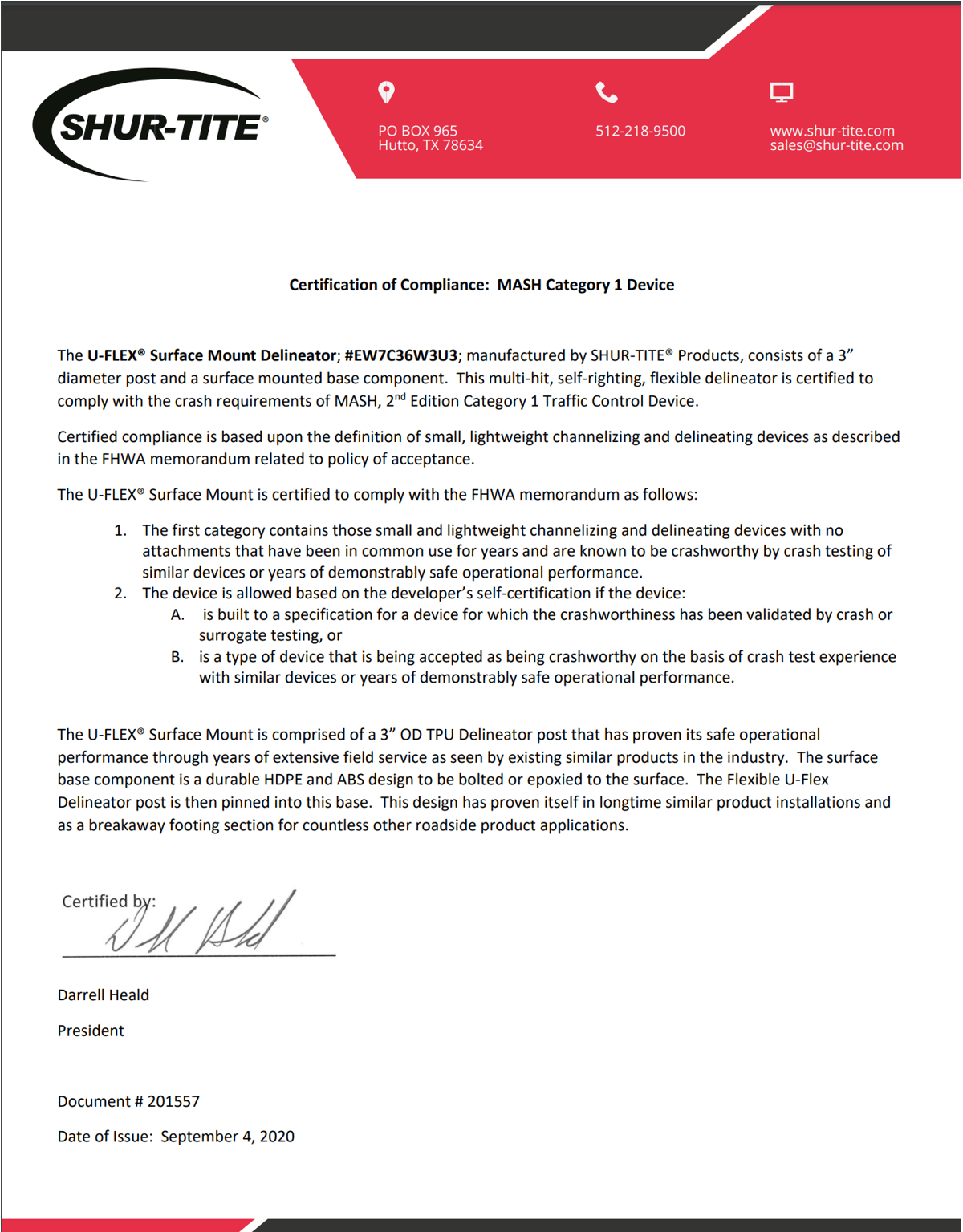 The U-Flex Urethane surface mounted delineator post from Traffic Safety Store is proven to withstand more impacts from both bumpers and tires (NTPEP 200 Impact Test at 70 MPH) than any other post on the market. What does this mean to the installer? Simple – less hazardous “time in traffic” replacing damaged or destroyed road markers.