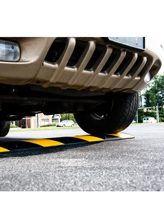 Recycled Rubber 4-foot rubber speed bumps are 12 inches wide and 2.25 inches tall at the highest point. Reflective Yellow Stripes and Cats-Eye Reflectors improve night time visibility. Helps reduce car speeds to 2 to 5 mph without impact to the vehicle. It's easily installed and removed thanks to recessed bolt holes. Made from 100 percent recycled tires, the strongest rubber available. These 4 foot speed bumps are 4 feet long 12 inches wide and 2.25 inches tall at the highest point. In Stock for Immediate Shipping.