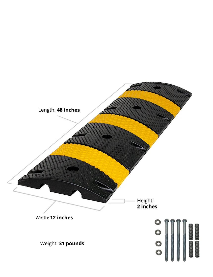 Each middle section length is 48" and weighs approximately 31 lbs . These middle sections can be joined with end caps (sold separately) to form a complete speed bump. They are easily cut to custom lengths to fit any area. Mounting Hardware Included. - Height: 2" - Width: 12" - Length: 48" - Weight: 31 lbs - Material: Vulcanized Rubber - Color: Black with yellow EPDM rubber stripes.