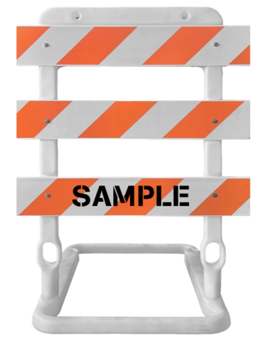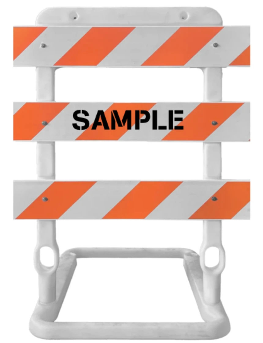 65" Tall, Plastic, MUTCD Type III Rail Holder w/ Three (3) 8" X 4' Reflective Rails w/ Engineer Grade (EG) Reflective Orange & White Rails w/ Custom Lettering On One (1) Rail
