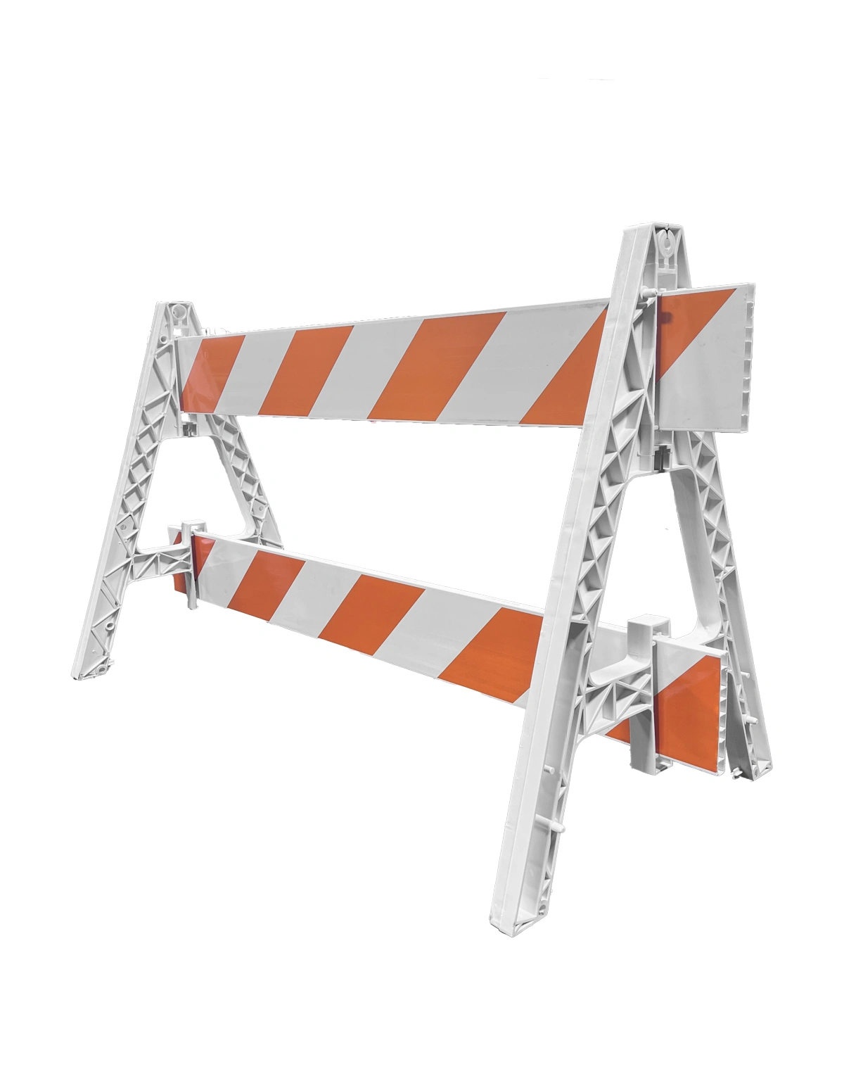 Our 6' Cortina A-Frame Kit contains 2 injection molded barricade legs and a reflective rail that creates a complete eight foot Type I or Type II barricade. LED flashers can be installed on the bolt holes at the top of each leg. These sawhorse style barriers can be placed lengthwise, creating an inexpensive, effective and highly visible pedestrian barricade for property or workzones. Contains molded in lugs for easy stacking and storage. Approved for NCHRP-350 crash test rating.
