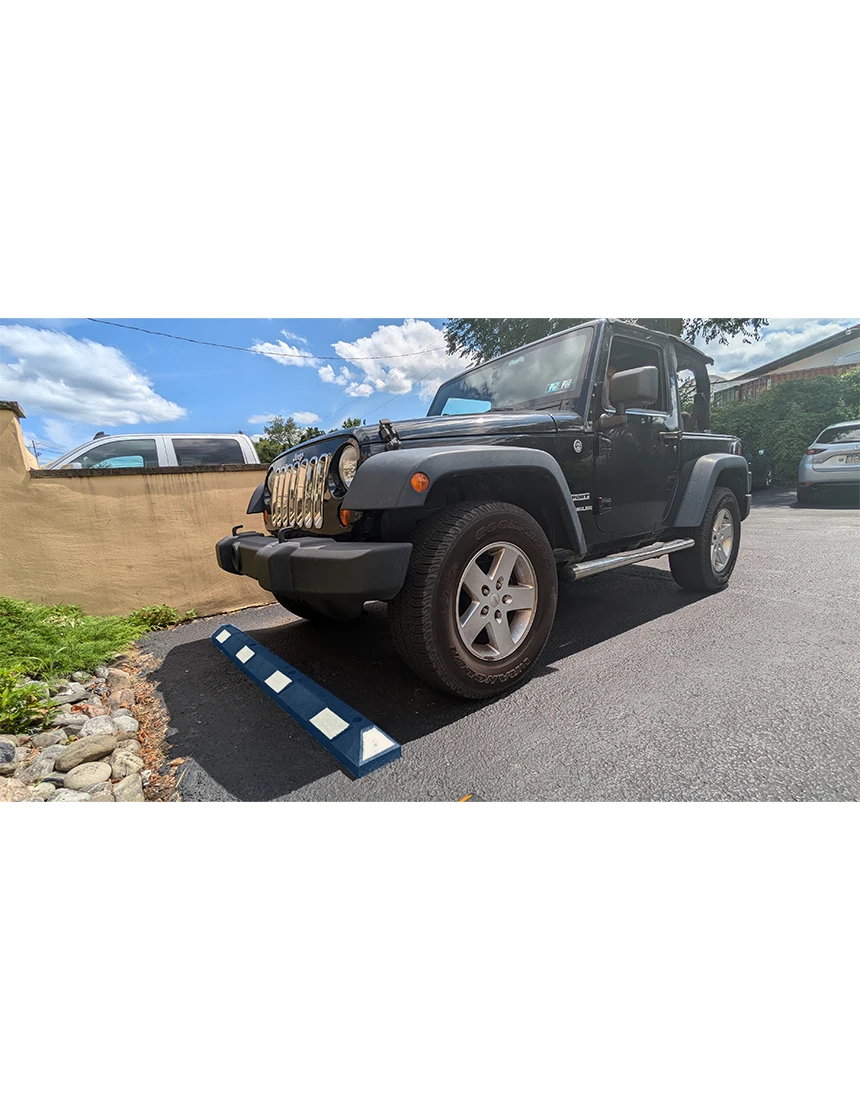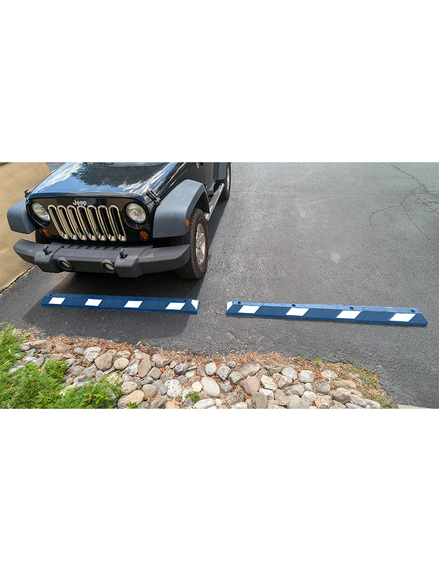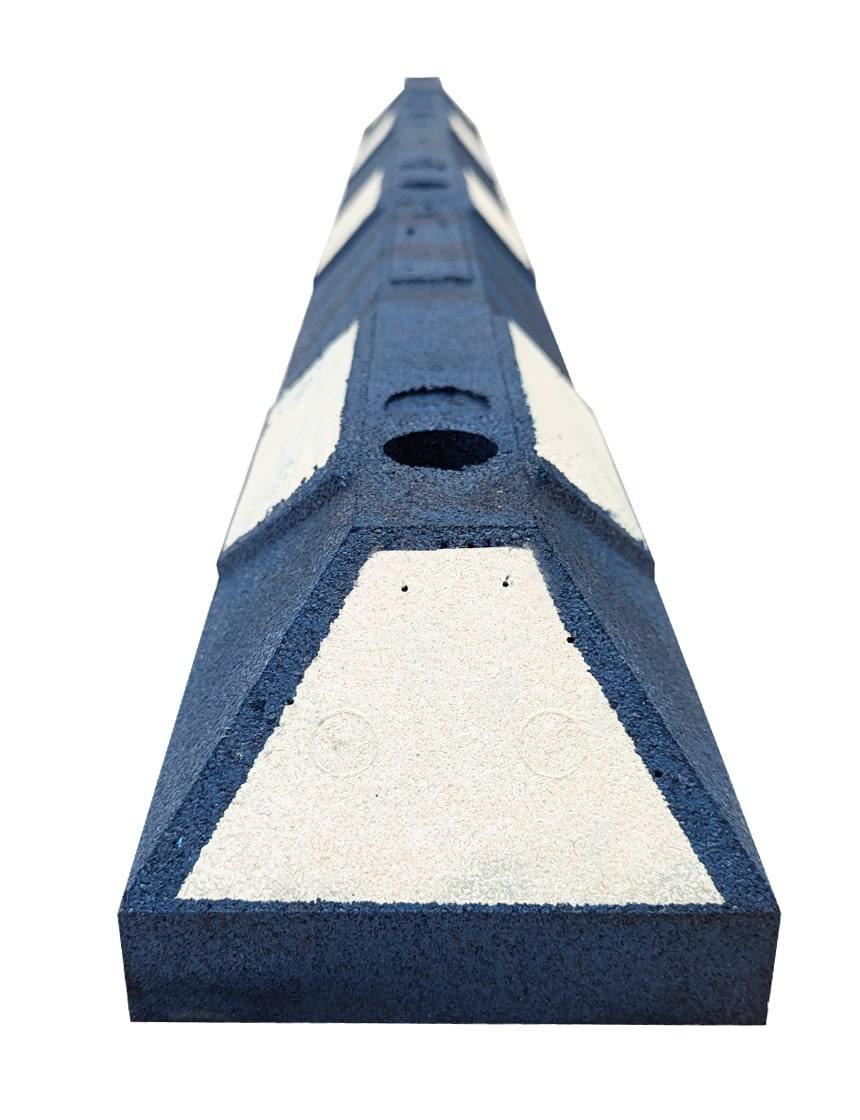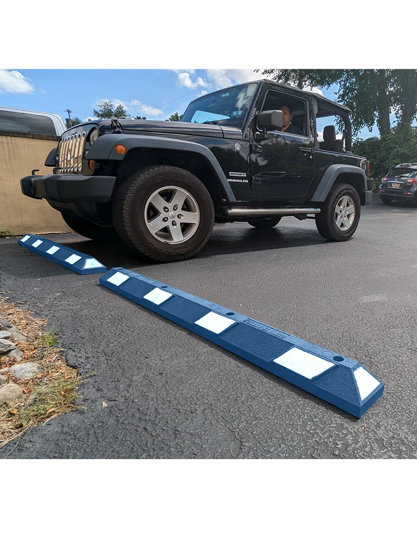 6 ft rubber parking blocks blue white reflective 13 in galvanized rebar steel spikes asphalt or gravel