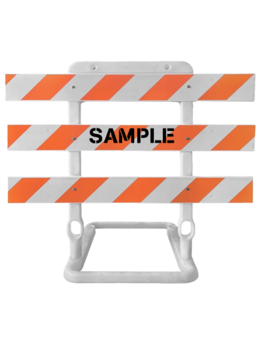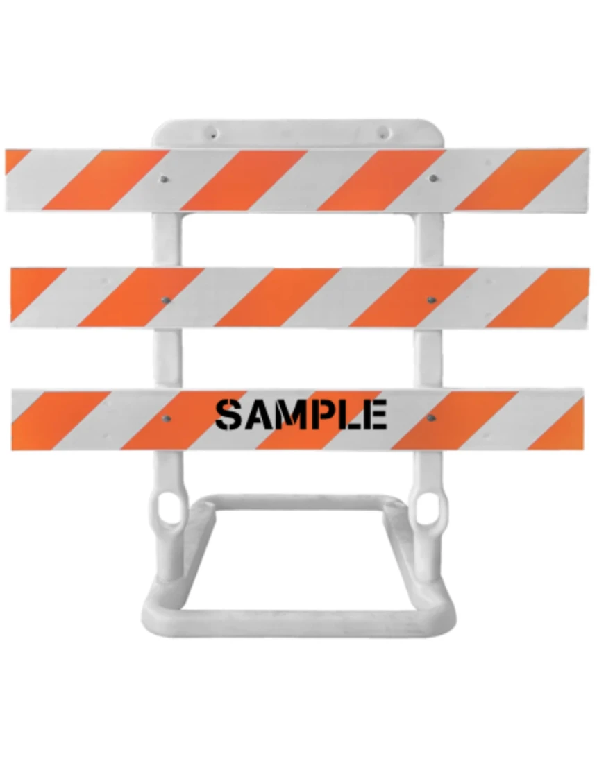 65" Tall, Plastic, MUTCD Type III Rail Holder w/ Three (3) 8" X 6' Reflective Rails w/ Engineer Grade (EG) Reflective Orange & White Rails w/ Custom Lettering On One (1) Rail
