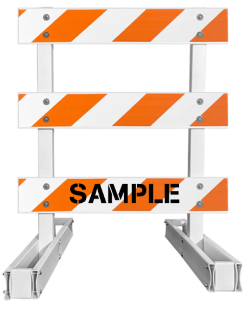 60" Tall MUTCD Type III Barricade -Break-Away System & Three 4' Plastic Boards w/HI Sheeting On Both Sides Of Rails & Custom Lettering
