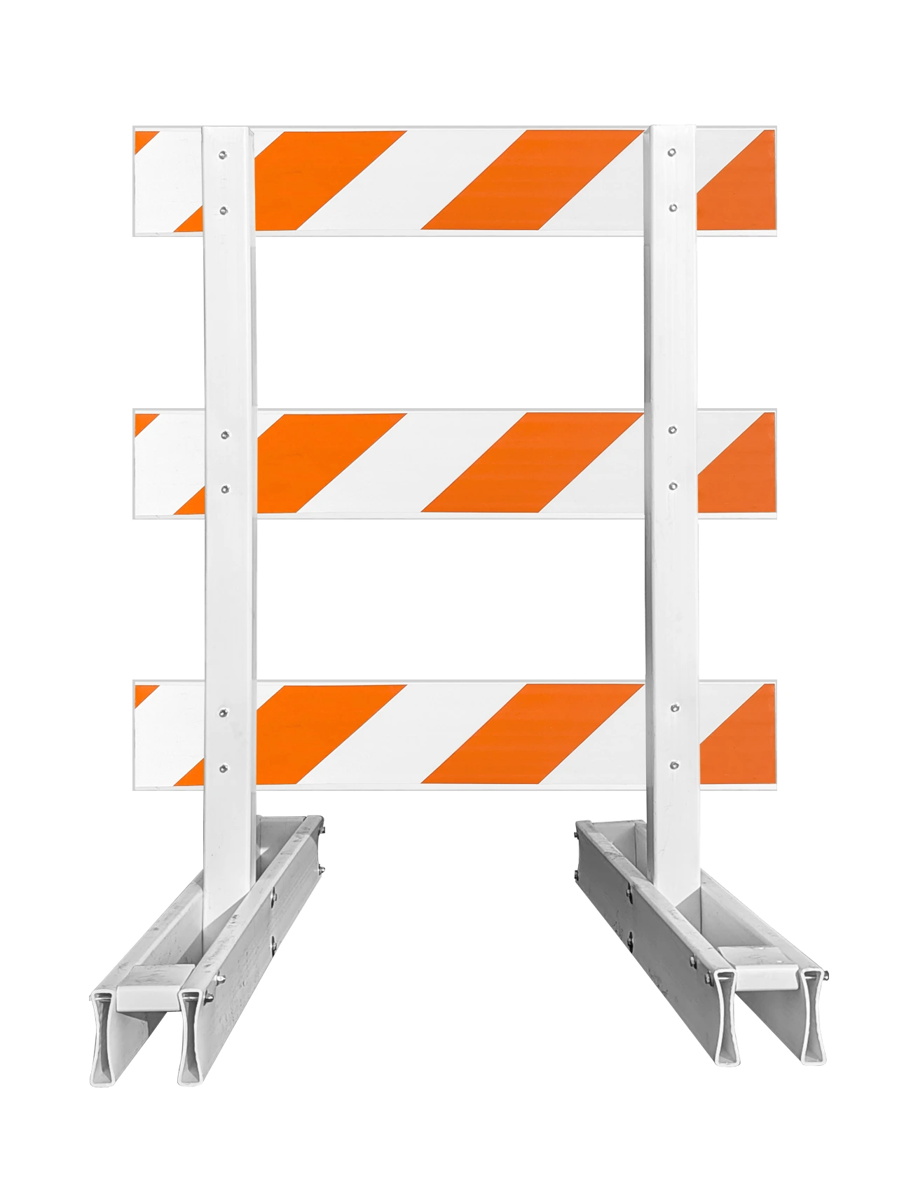 - Three (3) 4' x 8" x 1" Plastic Rails with Orange & White Reflective Sheeting (Choose Engineer Grade (EG) or High Intensity (HI) sheeting)