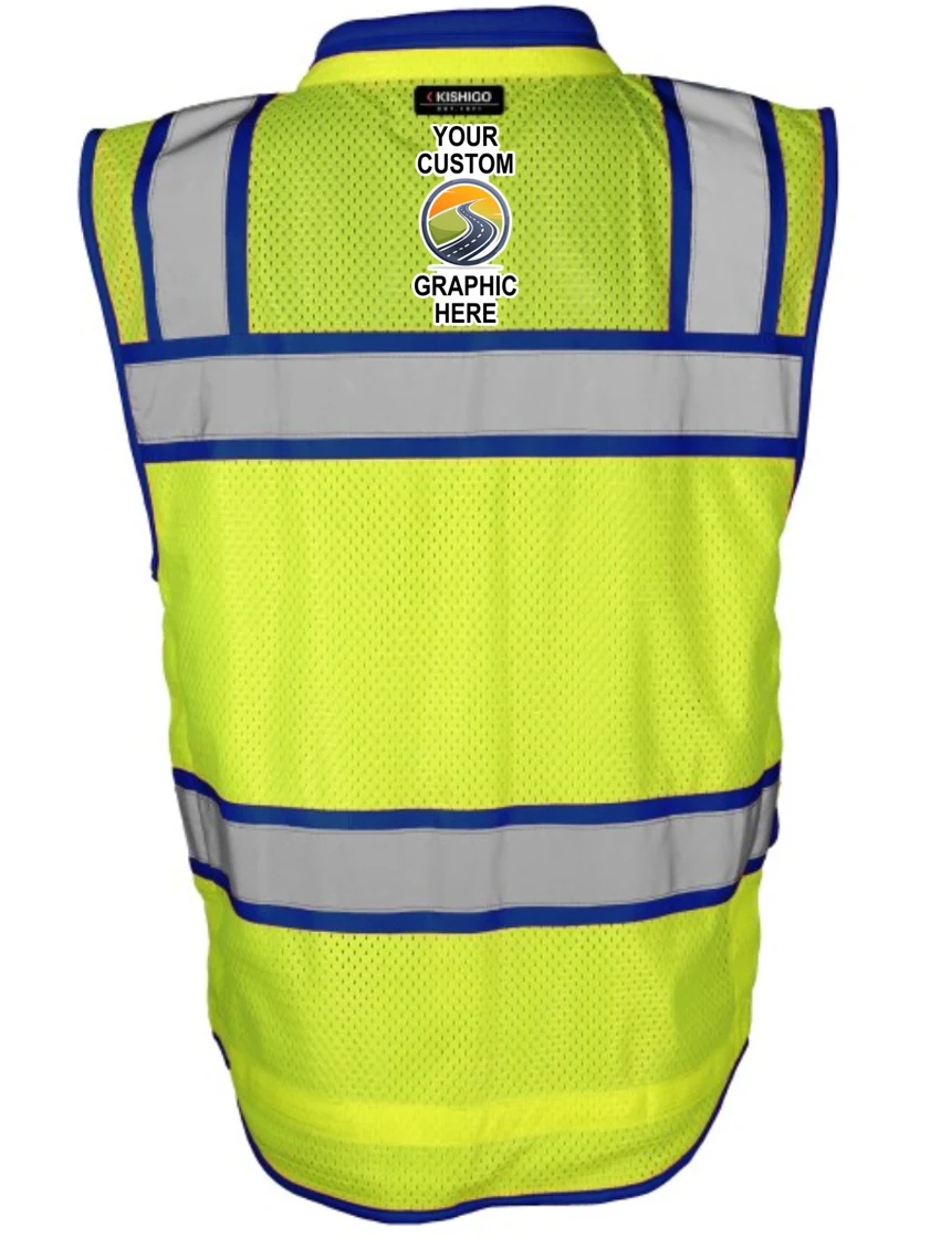 Kishigo Color Contrast High Performance Surveyors Lime & Blue, Class 2 Safety Vest, Small with Full Color Graphic