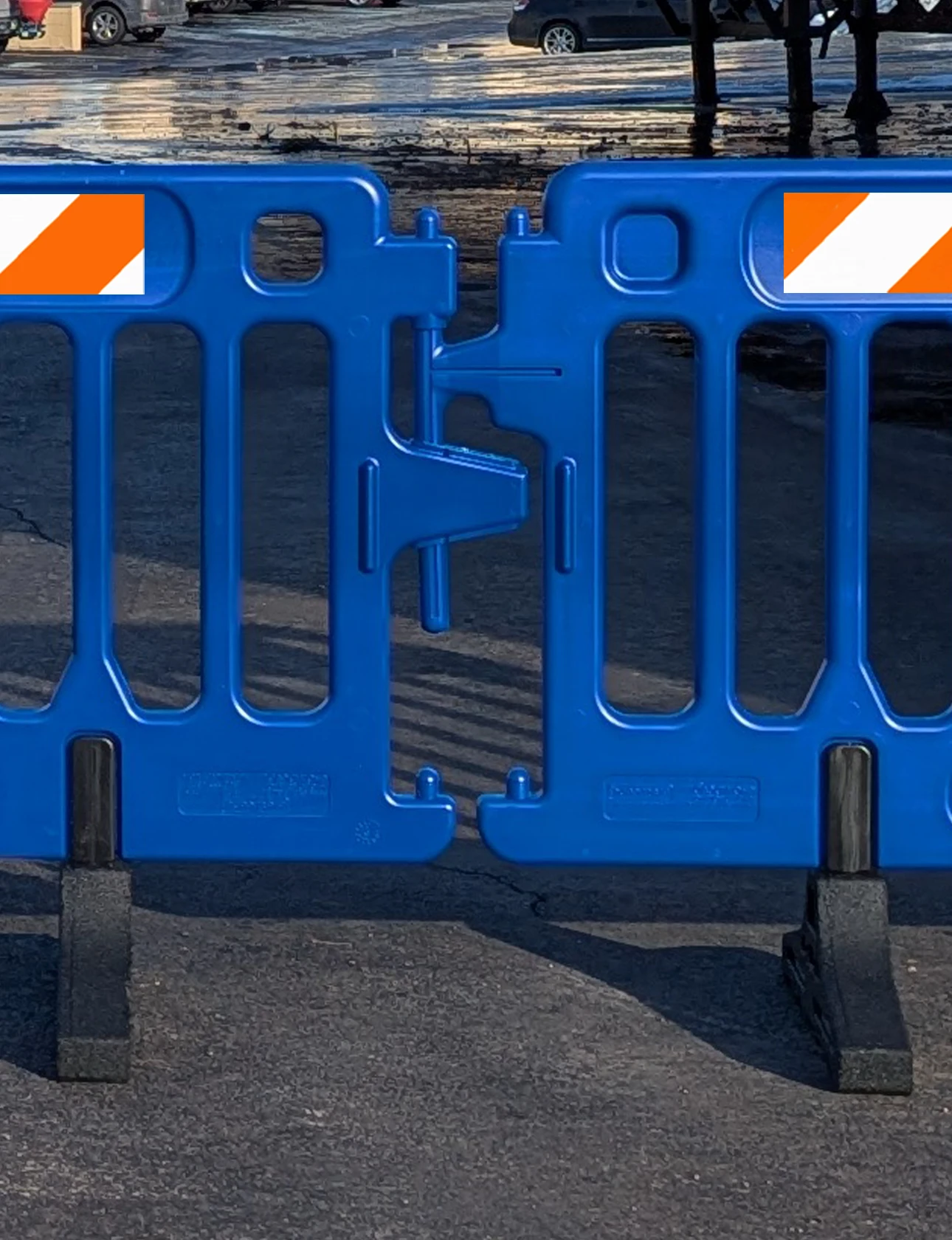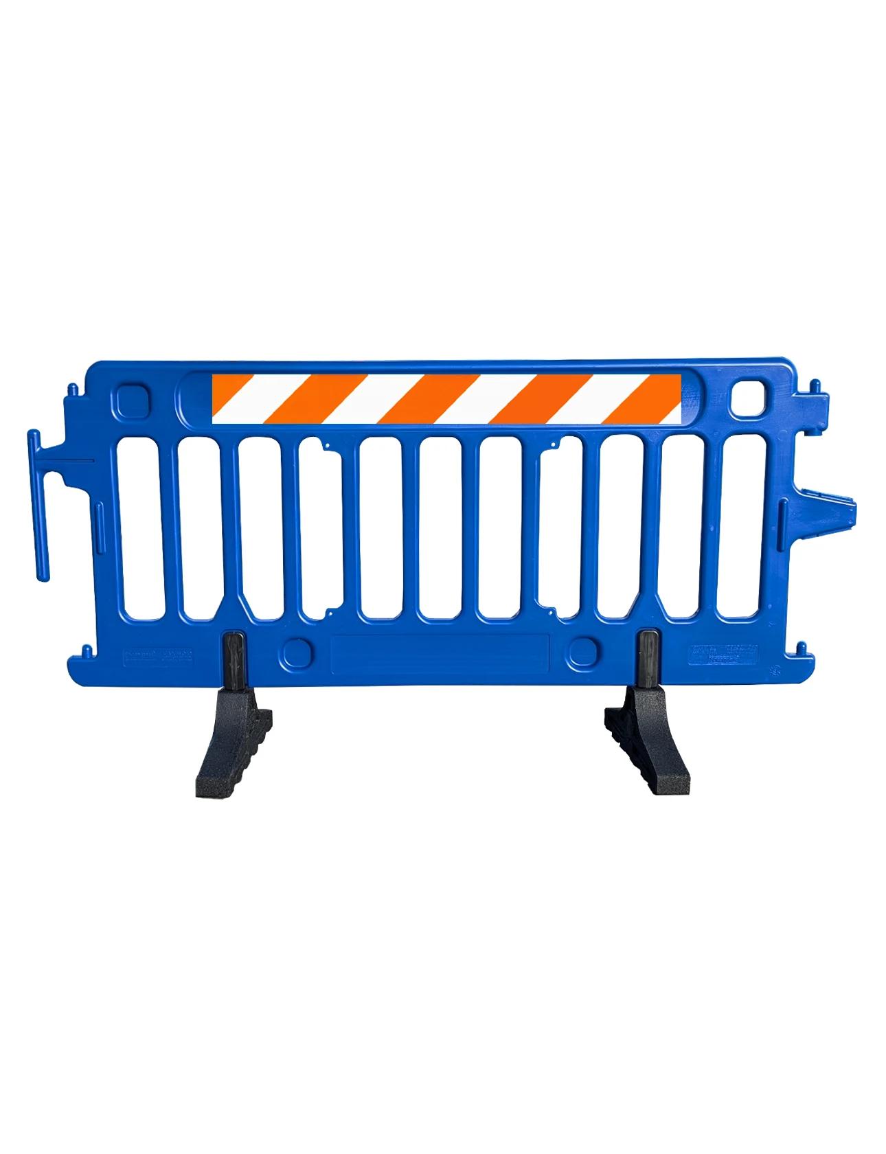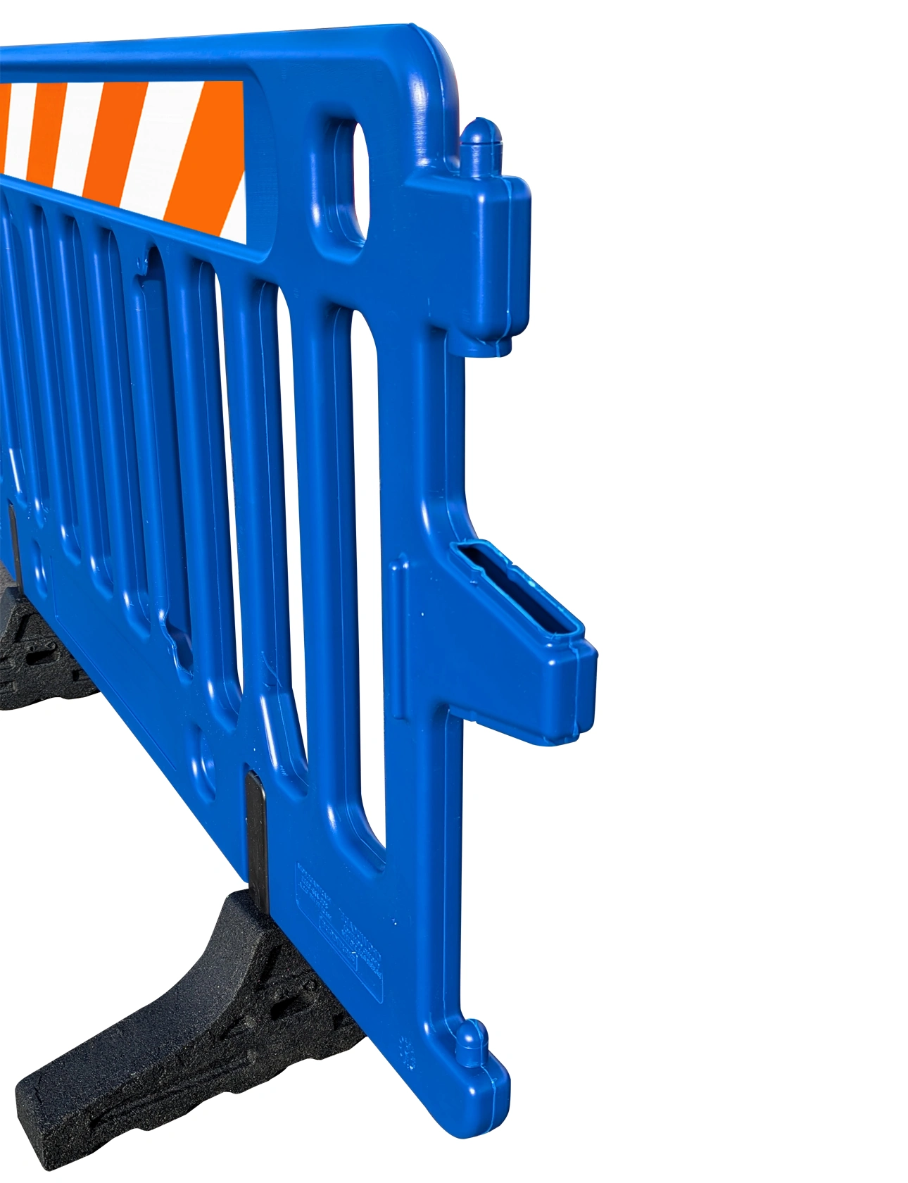 - Secure Interlocking Brackets: Tool-free linking system allows quick connection of multiple barricades. Pivoting brackets accommodate curves and uneven ground.