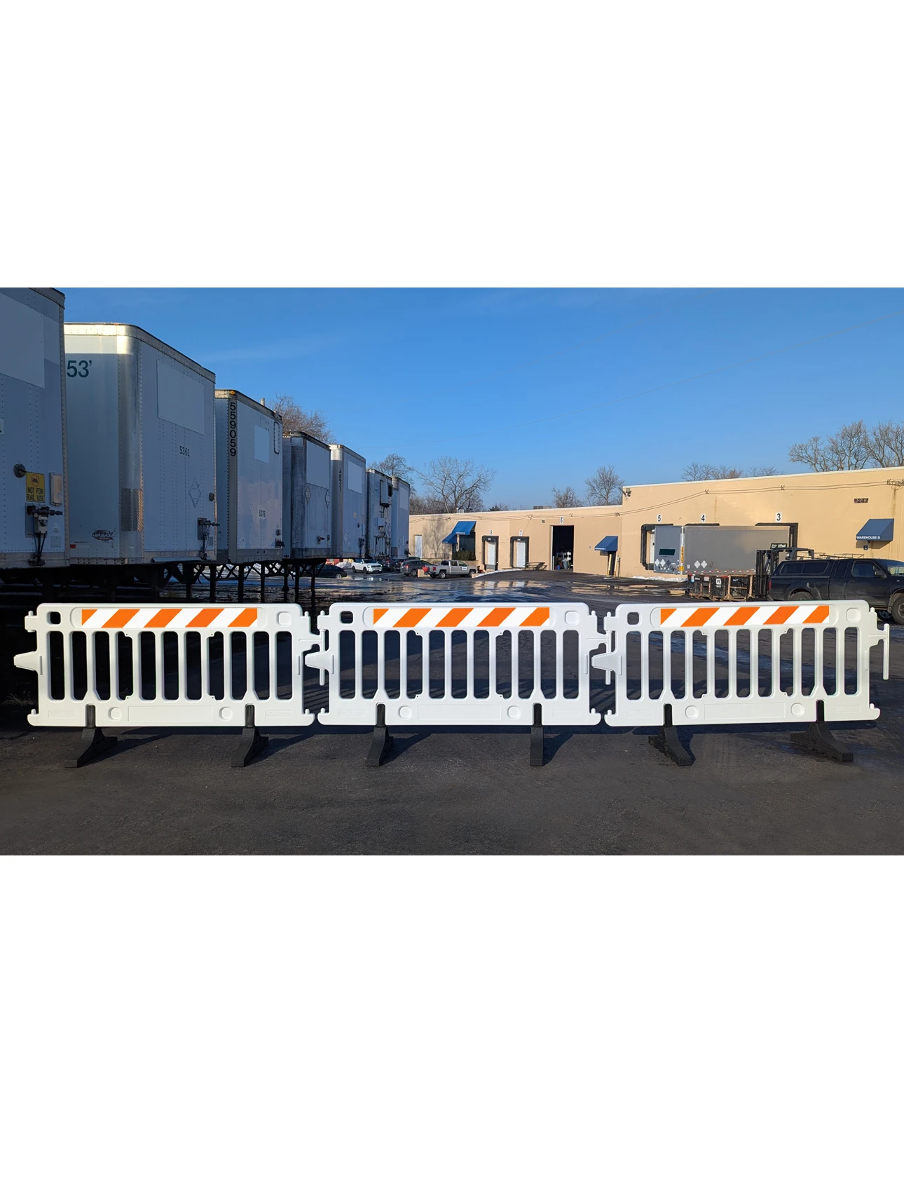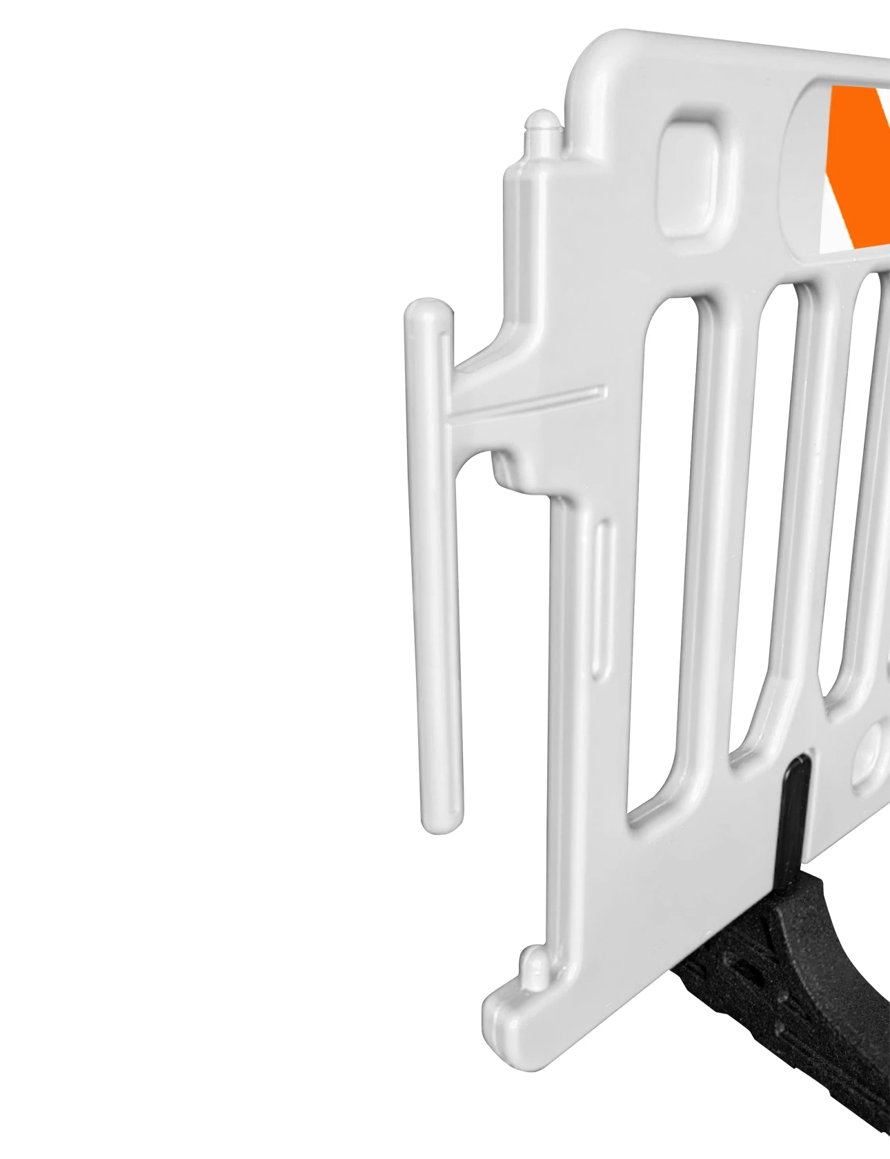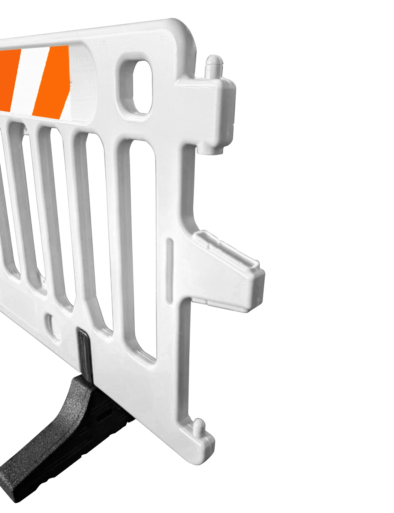 - Secure Interlocking Brackets: Tool-free linking system allows quick connection of multiple barricades. Pivoting brackets accommodate curves and uneven ground.