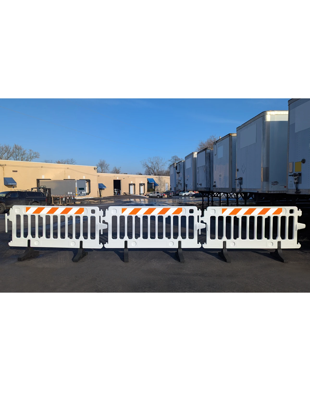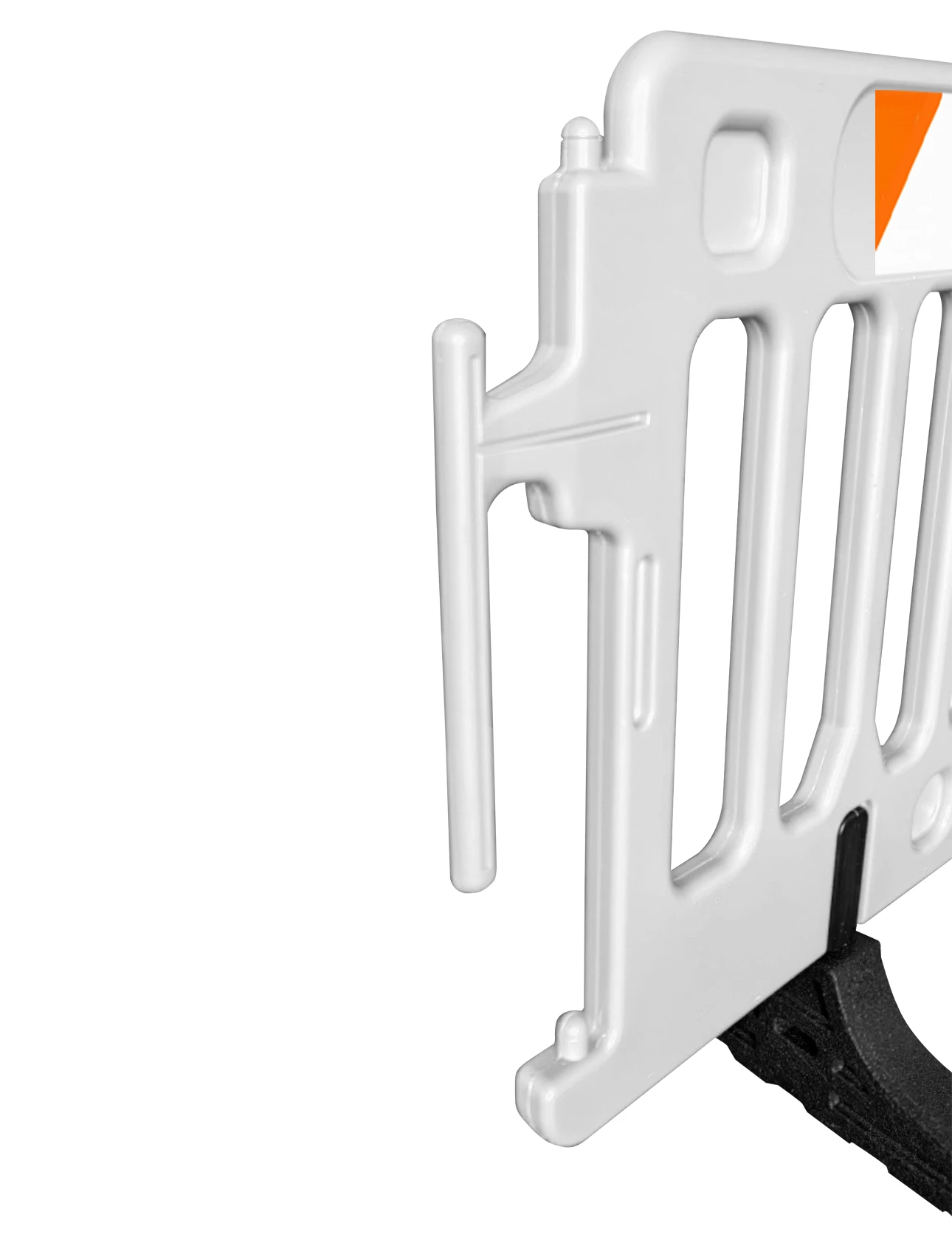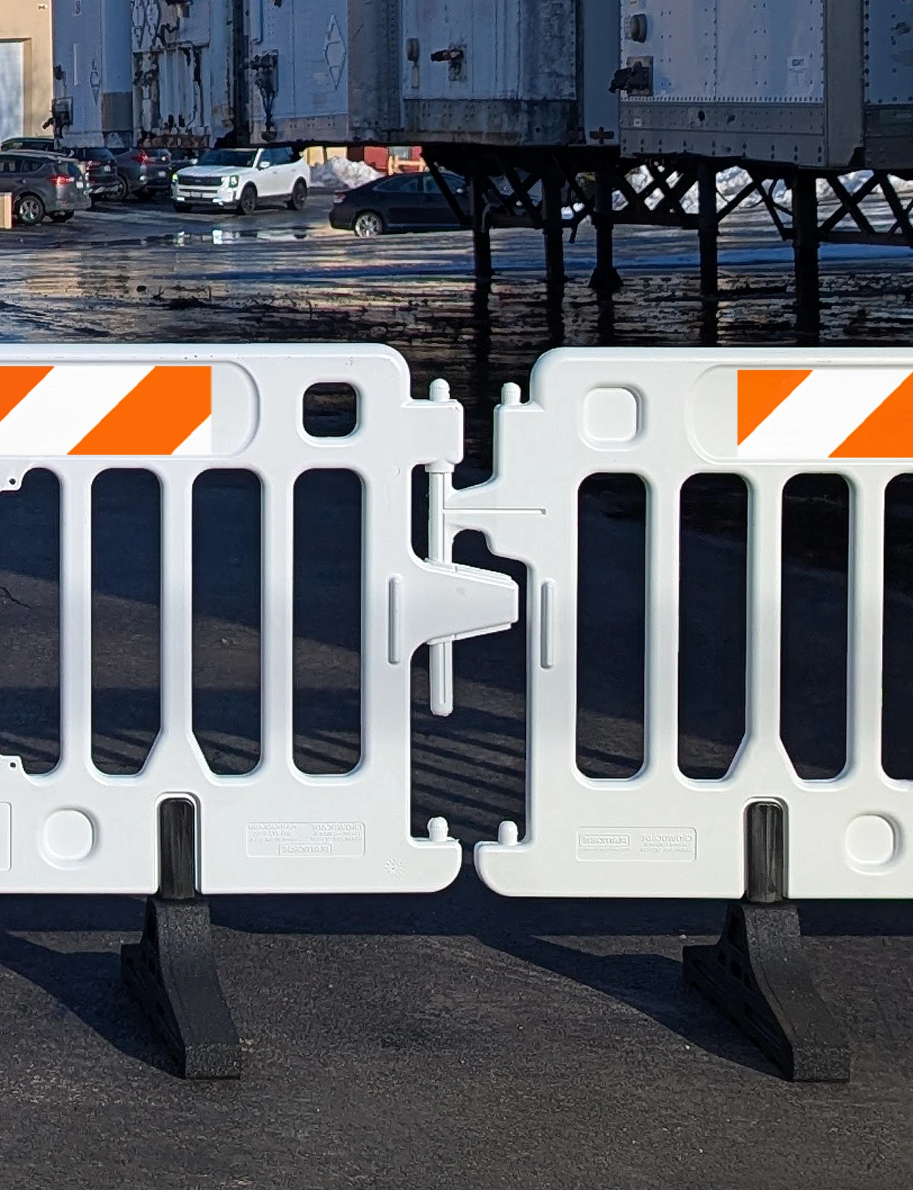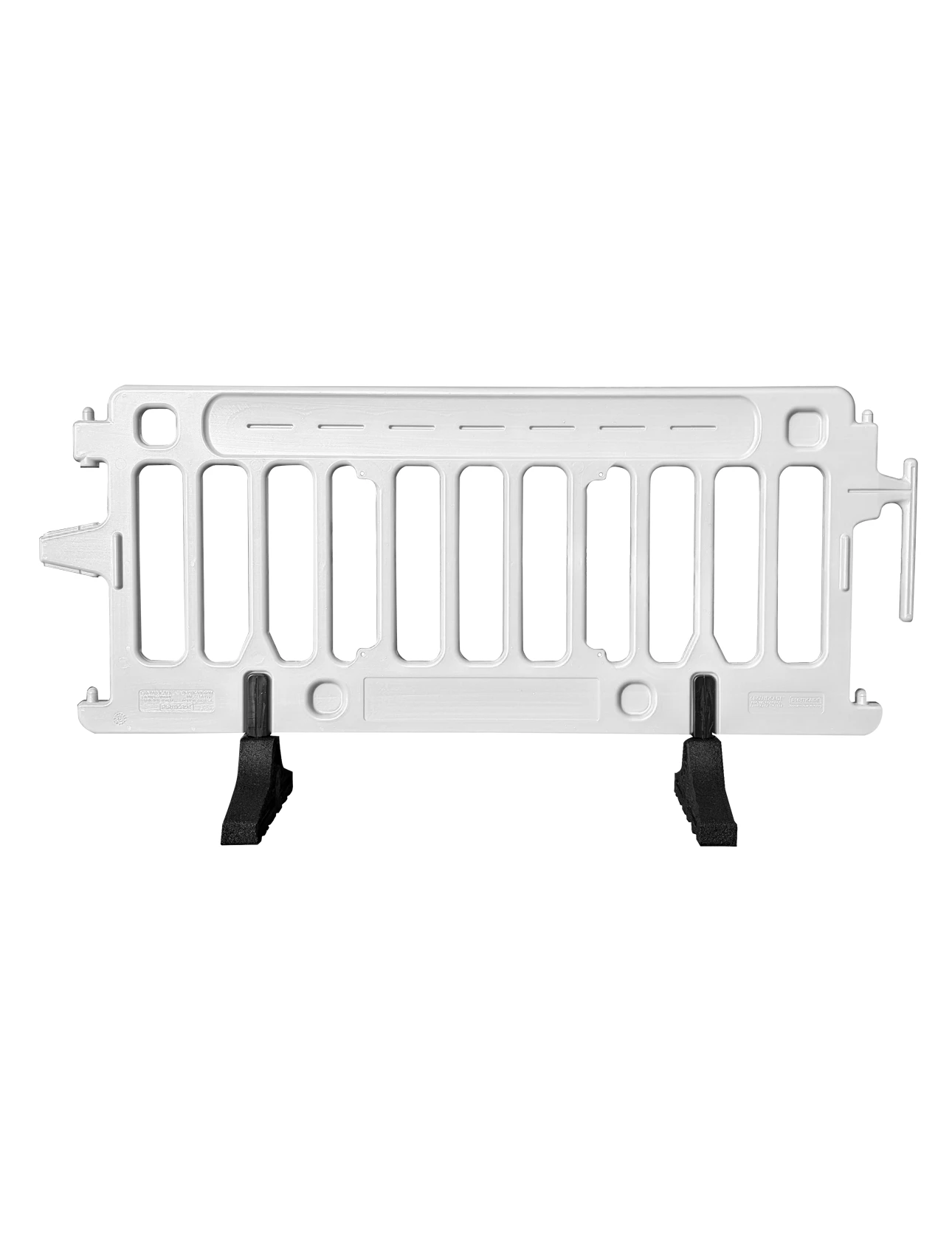 - Secure Interlocking Brackets: Tool-free linking system allows quick connection of multiple barricades. Pivoting brackets accommodate curves and uneven ground.