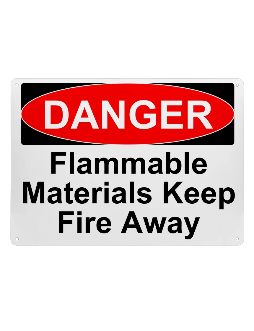 14" tall x 10" wide plastic sign with mounting holes, Danger Flammable Materials Keep Fire Away