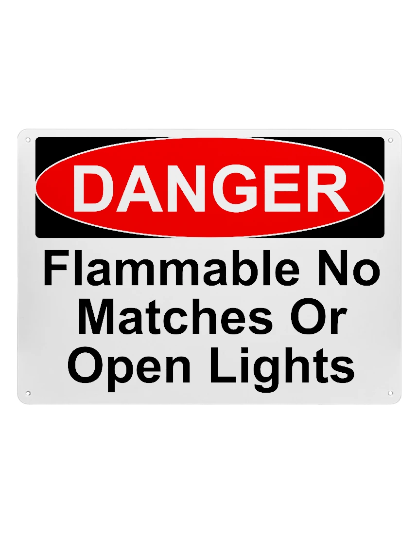 14" tall x 10" wide plastic sign with mounting holes, Danger Flammable No Matches Or Open Lights