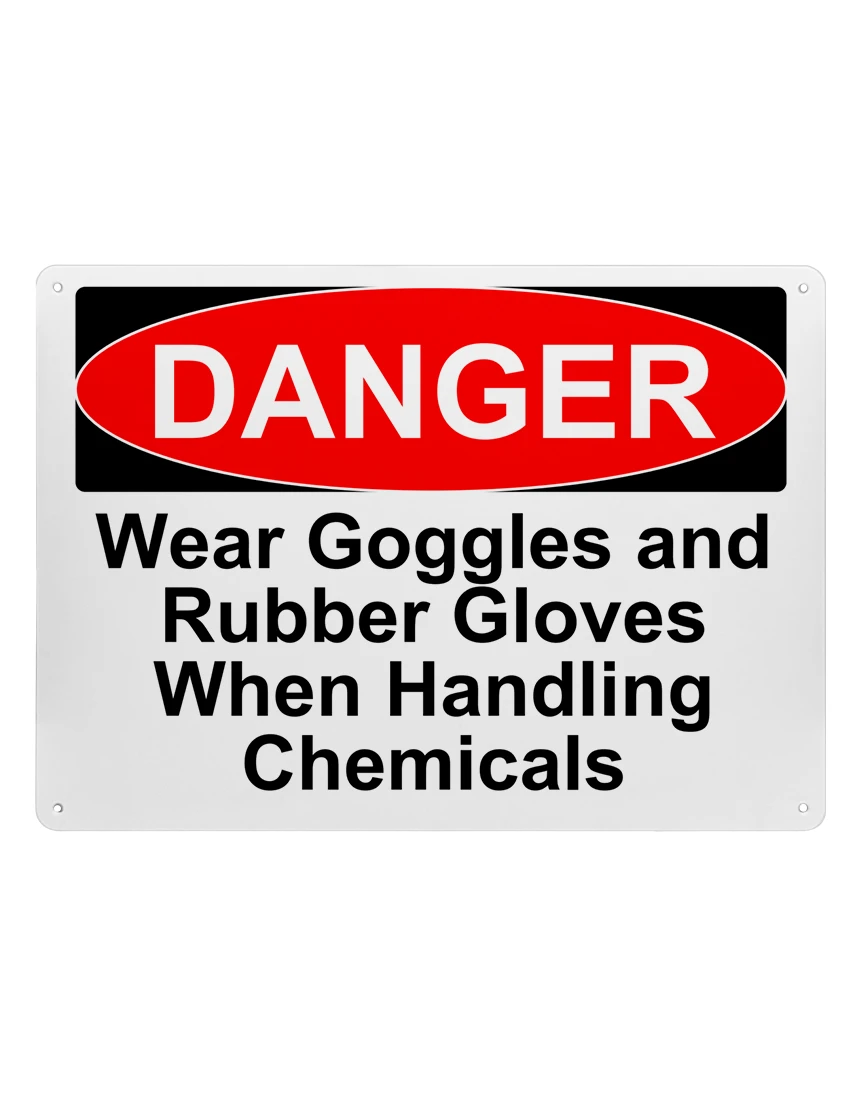 14" tall x 10" wide plastic sign with mounting holes, Danger Wear Goggles And Rubber Gloves When Handling Chemicals