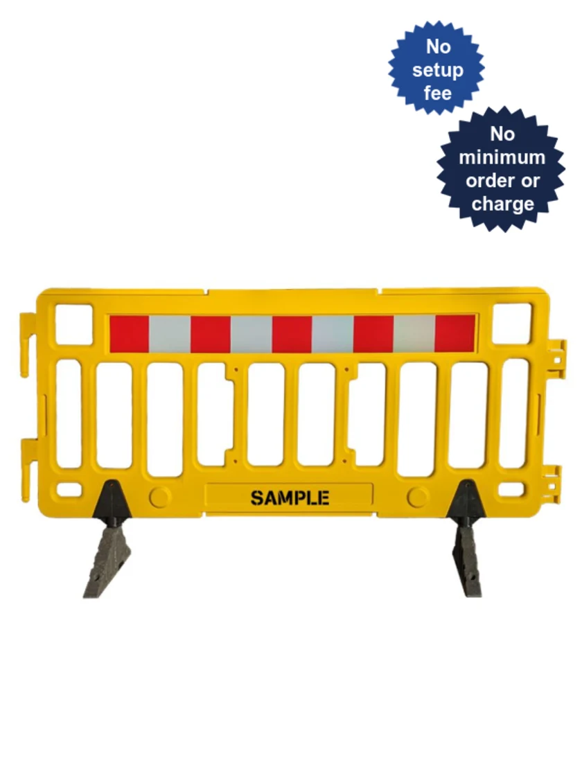 76" Yellow Economy Interlocking Pedestrian Fence w/ Custom Lettering
