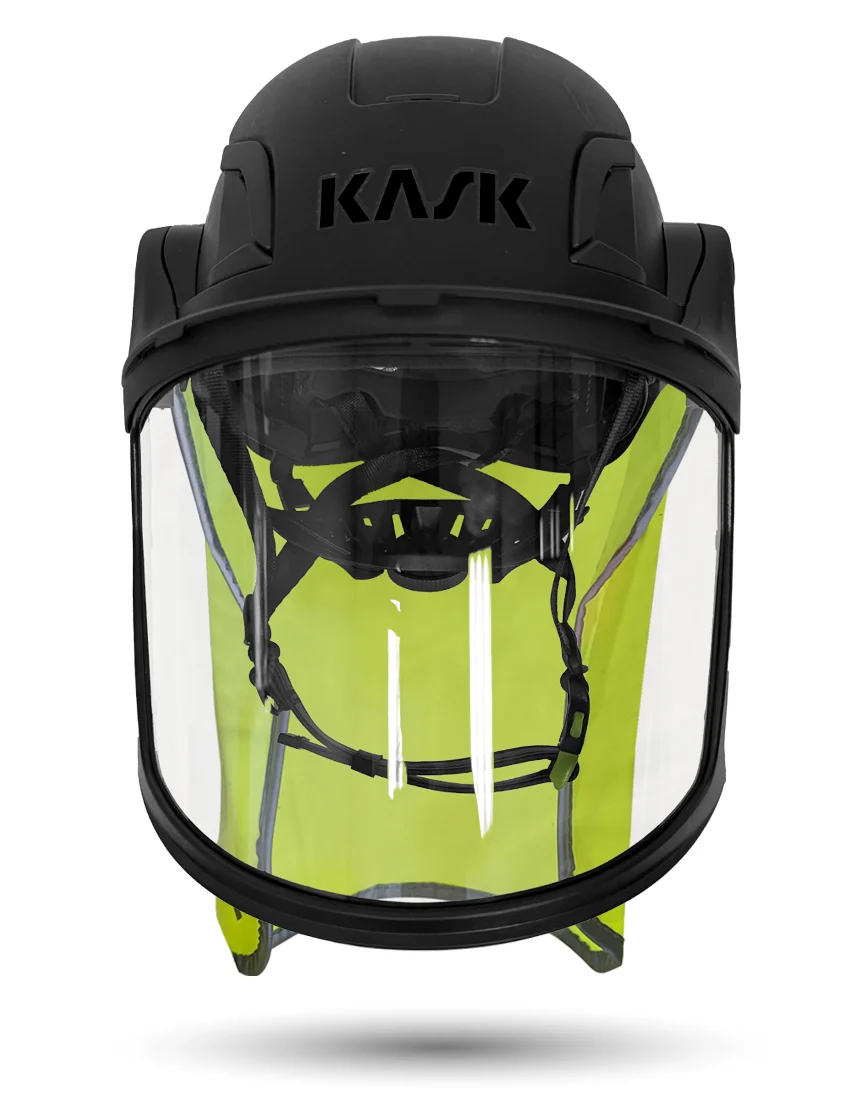 White Kask Zenith X2 ANSI Class E Safety Helmet w/ Full-Face Shield & Brim Kit (Clear) & 10" Neck Protector (Yellow Fluorescent)