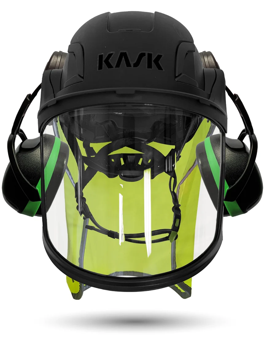 White Kask Zenith X2 ANSI Class E Safety Helmet w/ Full-Face Shield & Brim Kit (Clear) & Green Ear Muffs (Low To Medium Noise Reduction - 23-25 Db) & 360-Degree Sun Shield (Yellow Fluorescent)