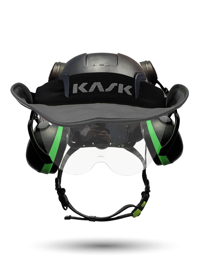 White Kask Zenith X2 ANSI Class E Safety Helmet w/ Full-Face Shield & Brim Kit (Clear) & Green Ear Muffs (Low To Medium Noise Reduction - 23-25 Db) & 360-Degree Sun Shield (Yellow Fluorescent)