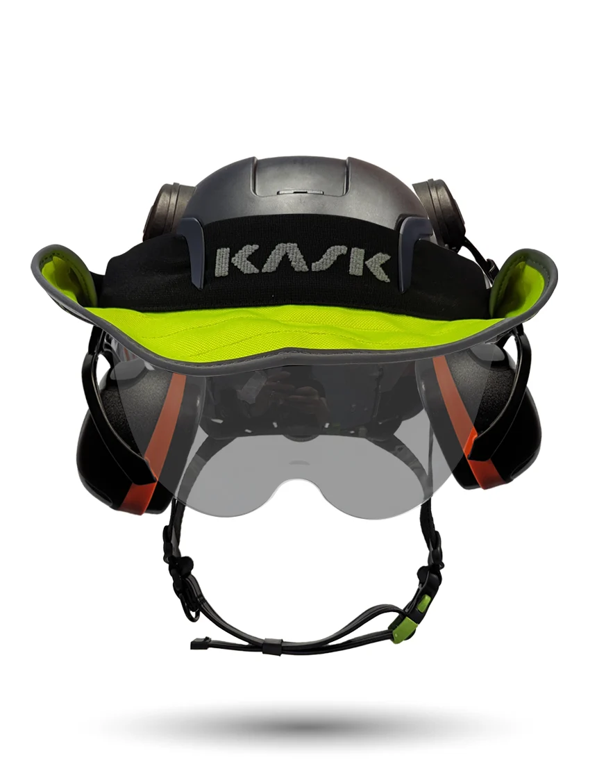White Kask Zenith X2 ANSI Class E Safety Helmet w/ Full-Face Shield & Brim Kit (Clear) & Green Ear Muffs (Low To Medium Noise Reduction - 23-25 Db) & 360-Degree Sun Shield (Yellow Fluorescent)