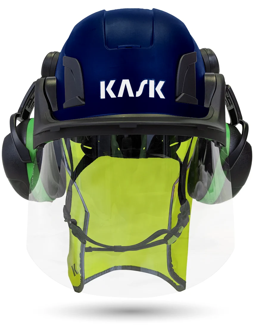 White Kask Zenith X2 ANSI Class E Safety Helmet w/ Full-Face Shield & Brim Kit (Clear) & Green Ear Muffs (Low To Medium Noise Reduction - 23-25 Db) & 360-Degree Sun Shield (Yellow Fluorescent)