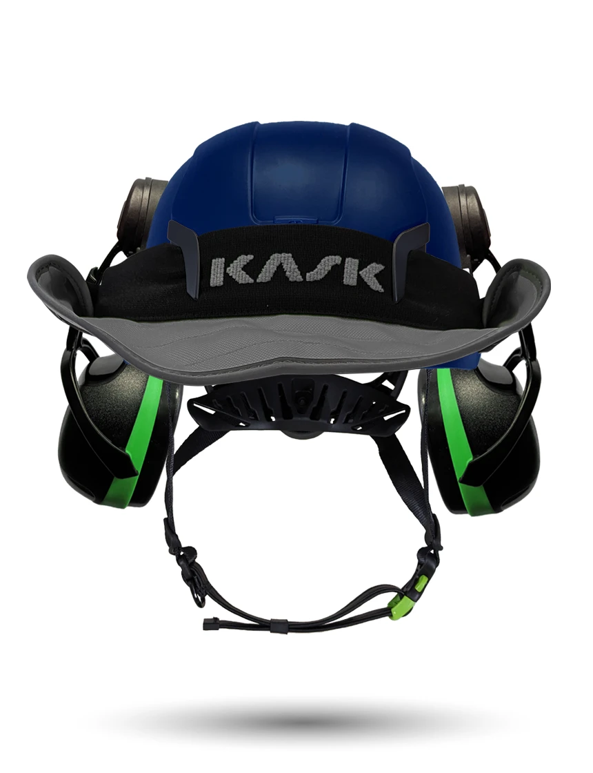 White Kask Zenith X2 ANSI Class E Safety Helmet w/ Full-Face Shield & Brim Kit (Clear) & Green Ear Muffs (Low To Medium Noise Reduction - 23-25 Db) & 360-Degree Sun Shield (Yellow Fluorescent)