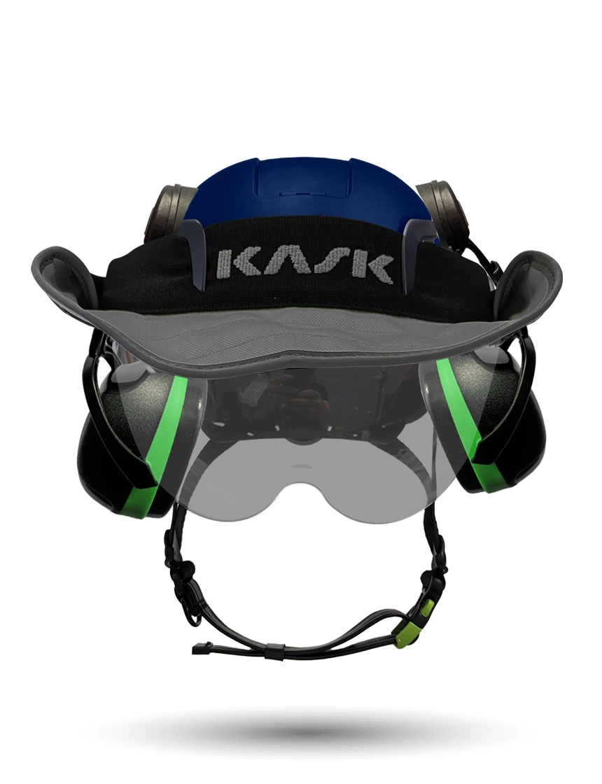 White Kask Zenith X2 ANSI Class E Safety Helmet w/ Full-Face Shield & Brim Kit (Clear) & Green Ear Muffs (Low To Medium Noise Reduction - 23-25 Db) & 360-Degree Sun Shield (Yellow Fluorescent)