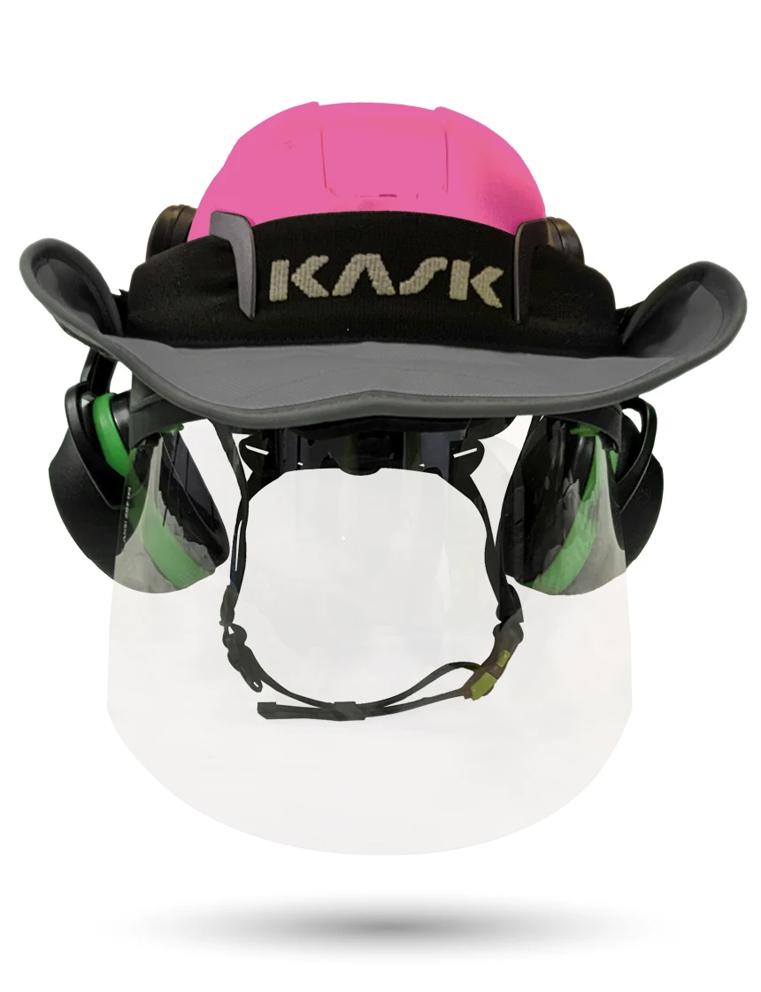 Pink Kask Zenith X2 ANSI Class E Safety Helmet w/ Full-Face Shield & Brim Kit (Clear) & Orange Ear Muffs (High Noise Reduction - 29-31 Db) & 360-Degree Sun Shield (Yellow Fluorescent)