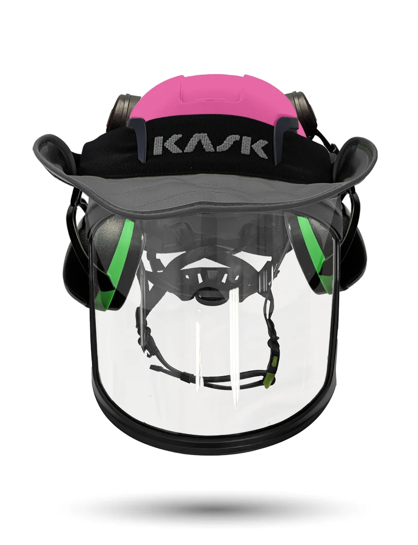 Pink Kask Zenith X2 ANSI Class E Safety Helmet w/ Full-Face Shield & Brim Kit (Clear) & Orange Ear Muffs (High Noise Reduction - 29-31 Db) & 360-Degree Sun Shield (Yellow Fluorescent)