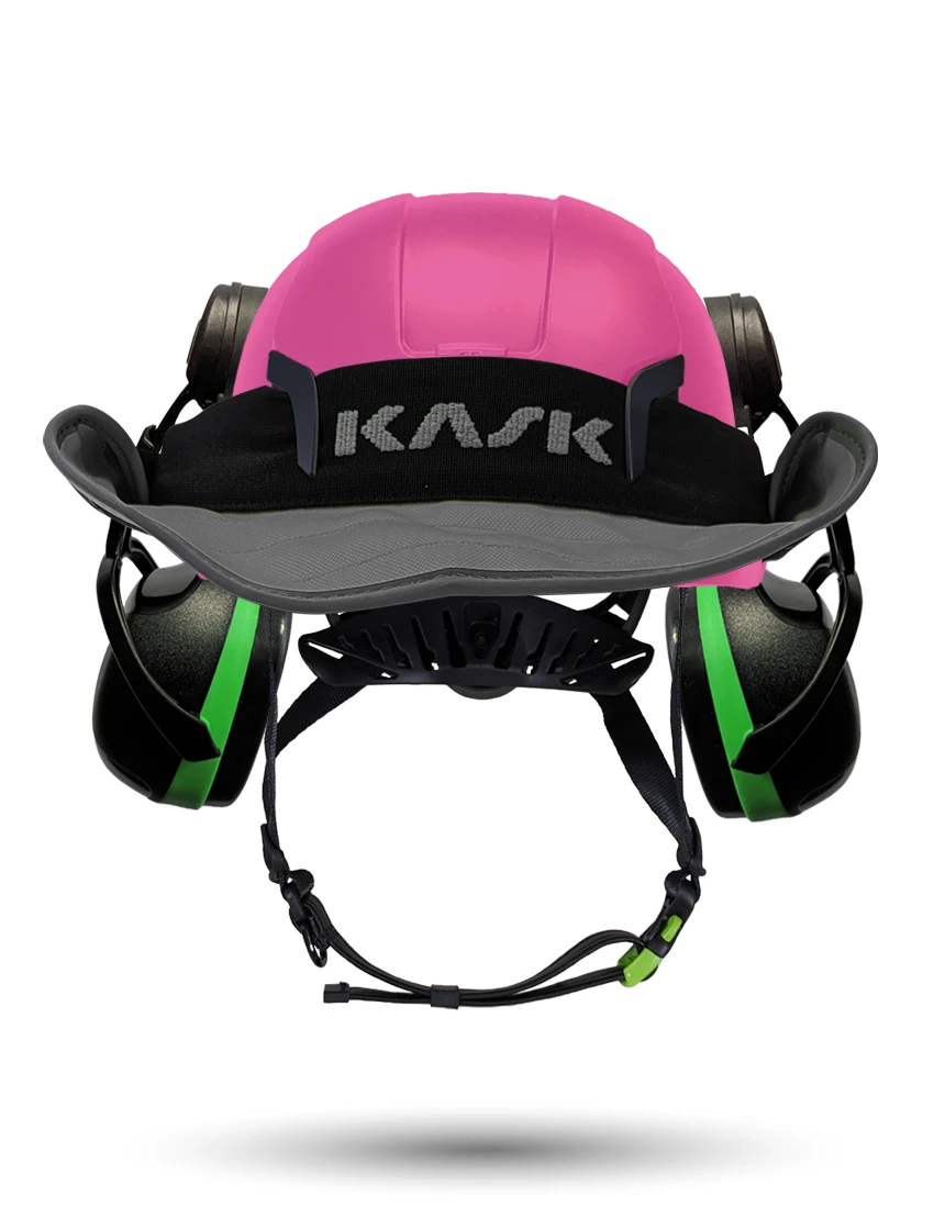 Pink Kask Zenith X2 ANSI Class E Safety Helmet w/ Full-Face Shield & Brim Kit (Clear) & Green Ear Muffs (Low To Medium Noise Reduction - 23-25 Db) & 10" Neck Protector (Yellow Fluorescent)