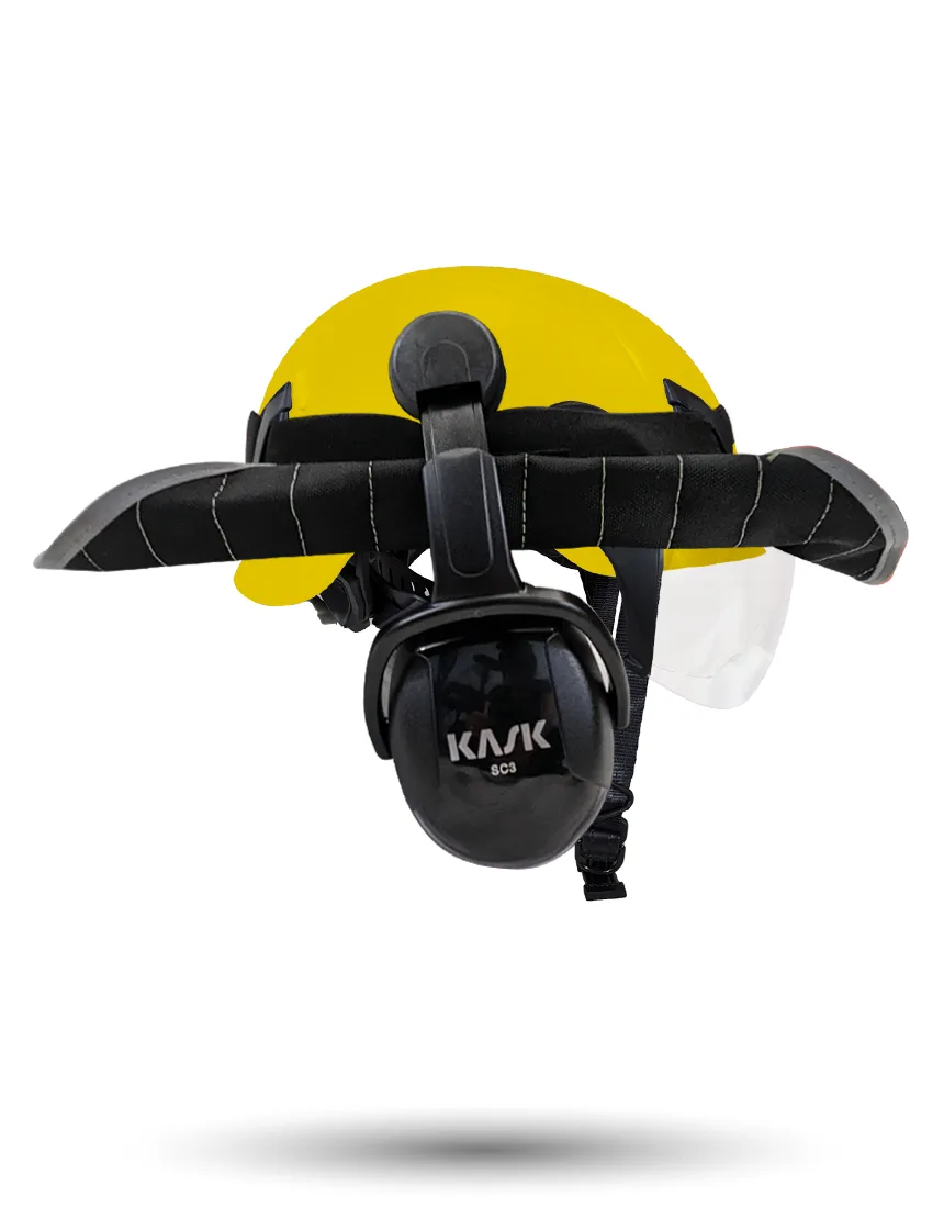 White Kask Zenith X2 ANSI Class E Safety Helmet w/ Full-Face Visor Kit (Clear) & Green Ear Muffs (Low To Medium Noise Reduction - 23-25 Db) & 360-Degree Sun Shield (Yellow Fluorescent)