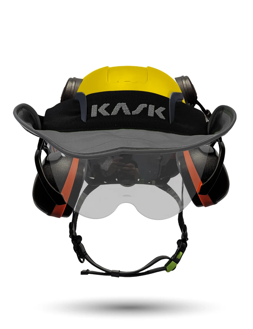 White Kask Zenith X2 ANSI Class E Safety Helmet w/ Full-Face Shield & Brim Kit (Clear) & Green Ear Muffs (Low To Medium Noise Reduction - 23-25 Db) & 360-Degree Sun Shield (Yellow Fluorescent)