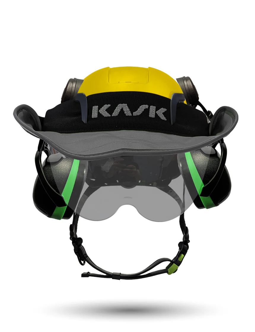 White Kask Zenith X2 ANSI Class E Safety Helmet w/ Full-Face Shield & Brim Kit (Clear) & Green Ear Muffs (Low To Medium Noise Reduction - 23-25 Db) & 360-Degree Sun Shield (Yellow Fluorescent)