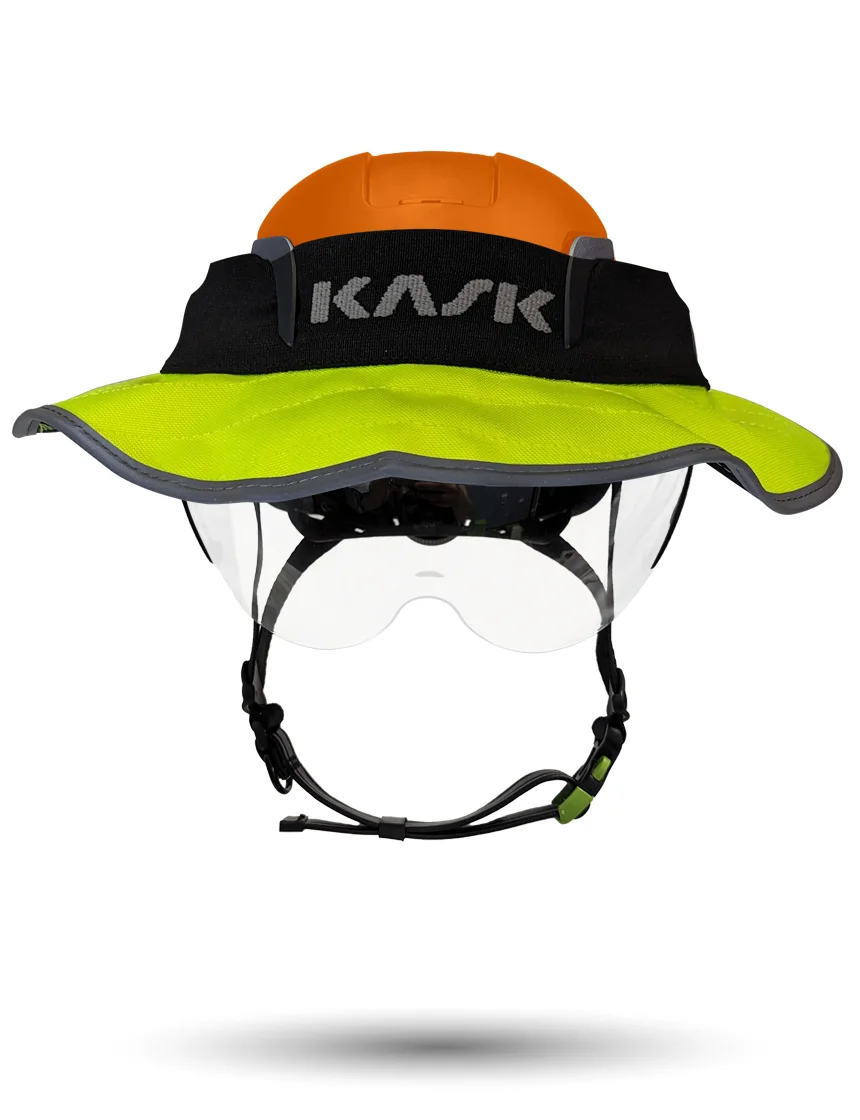 White Kask Zenith X2 ANSI Class E Safety Helmet w/ Full-Face Shield & Brim Kit (Clear) & 10" Neck Protector (Yellow Fluorescent)