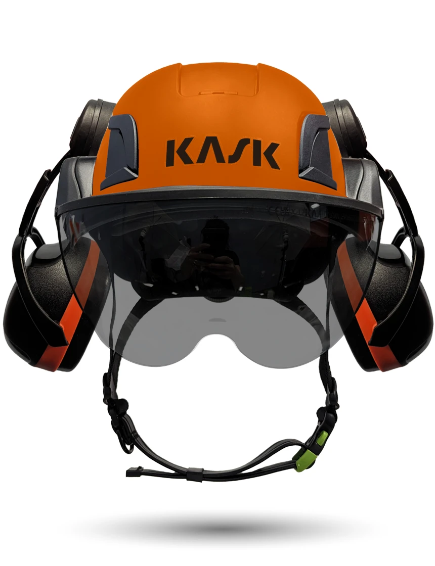 White Kask Zenith X2 ANSI Class E Safety Helmet w/ Full-Face Visor Kit (Clear) & Orange Ear Muffs (High Noise Reduction - 29-31 Db)