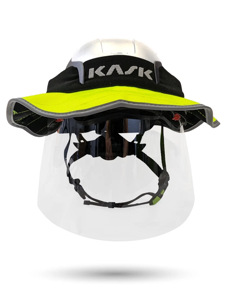 White Kask Zenith X2 ANSI Class E Safety Helmet w/ Full-Face Shield & Brim Kit (Clear) & 10" Neck Protector (Yellow Fluorescent)