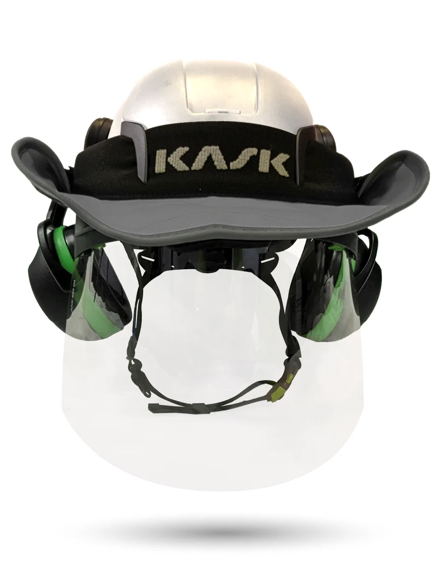 White Kask Zenith X2 ANSI Class E Safety Helmet w/ Full-Face Shield & Brim Kit (Clear) & Green Ear Muffs (Low To Medium Noise Reduction - 23-25 Db) & 360-Degree Sun Shield (Yellow Fluorescent)