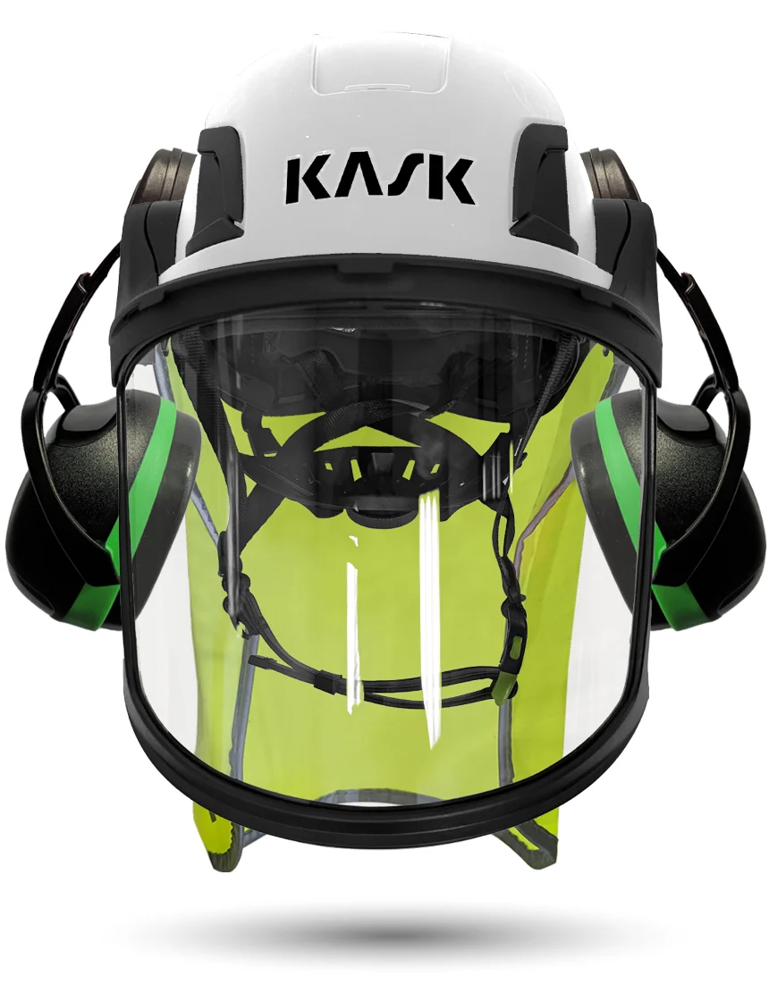 White Kask Zenith X2 ANSI Class E Safety Helmet w/ Full-Face Visor Kit (Clear) & Green Ear Muffs (Low To Medium Noise Reduction - 23-25 Db)