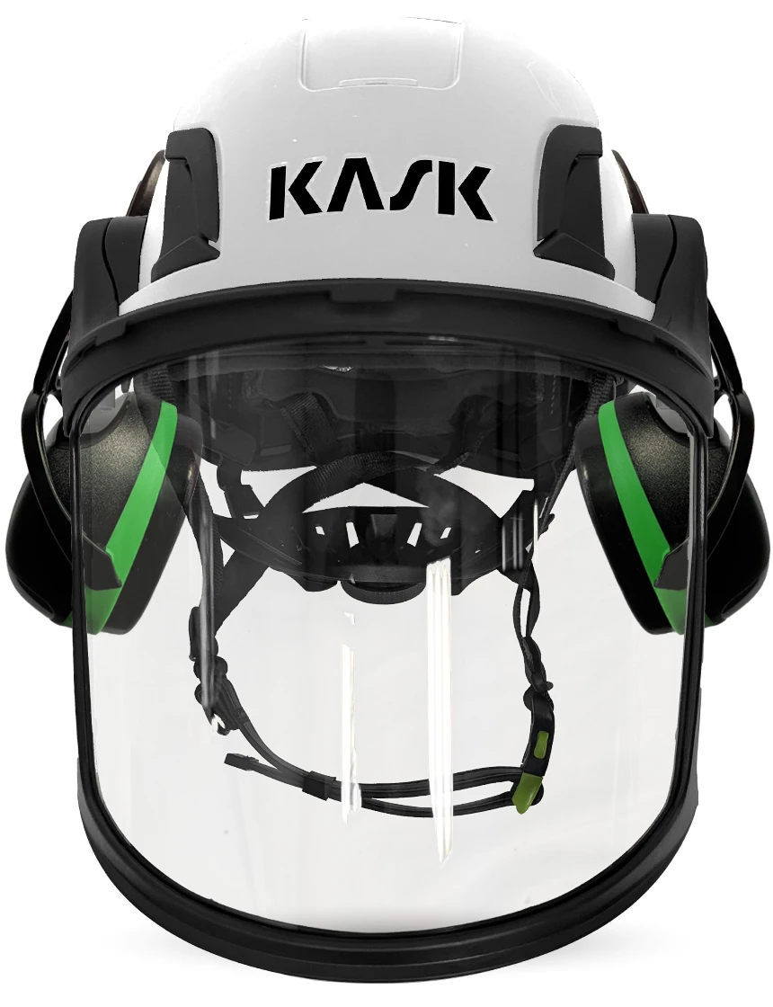 White Kask Zenith X2 ANSI Class E Safety Helmet w/ Full-Face Shield & Brim Kit (Clear) & Green Ear Muffs (Low To Medium Noise Reduction - 23-25 Db)