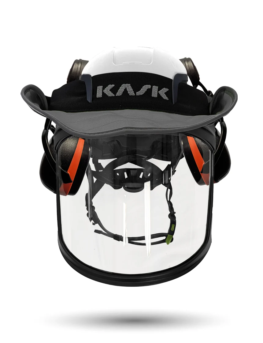 White Kask Zenith X2 ANSI Class E Safety Helmet w/ Full-Face Shield & Brim Kit (Clear) & Green Ear Muffs (Low To Medium Noise Reduction - 23-25 Db) & 360-Degree Sun Shield (Yellow Fluorescent)