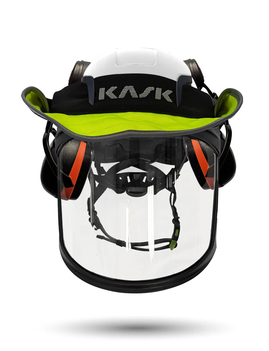 White Kask Zenith X2 ANSI Class E Safety Helmet w/ Full-Face Shield & Brim Kit (Clear) & Green Ear Muffs (Low To Medium Noise Reduction - 23-25 Db) & 360-Degree Sun Shield (Yellow Fluorescent)