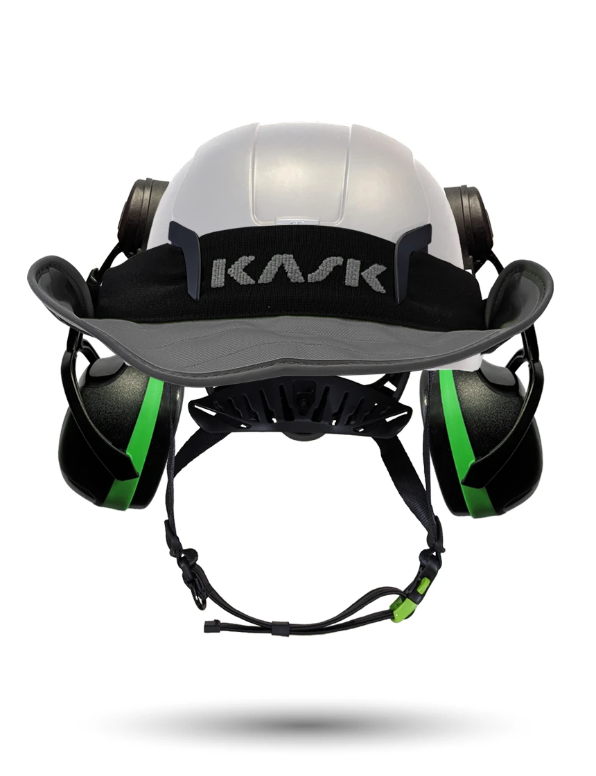 White Kask Zenith X2 ANSI Class E Safety Helmet w/ Full-Face Shield & Brim Kit (Clear) & Green Ear Muffs (Low To Medium Noise Reduction - 23-25 Db) & 360-Degree Sun Shield (Yellow Fluorescent)