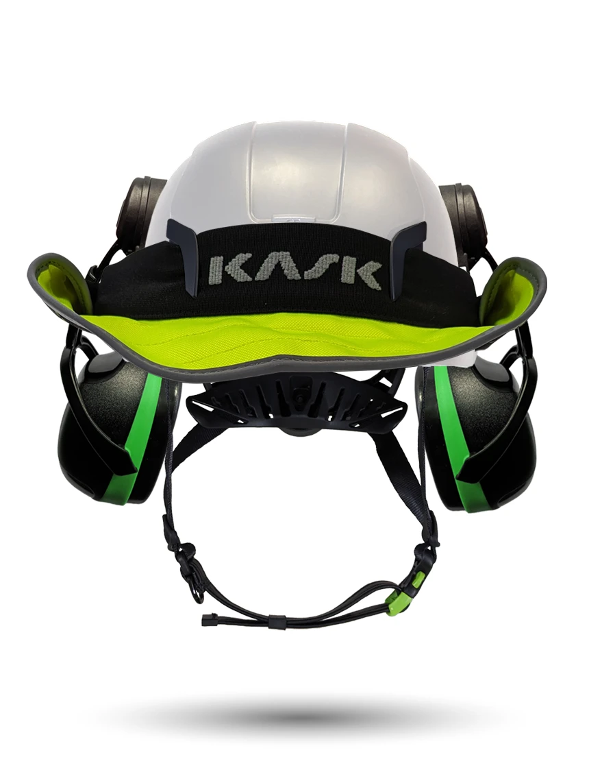White Kask Zenith X2 ANSI Class E Safety Helmet w/ Full-Face Shield & Brim Kit (Clear) & Green Ear Muffs (Low To Medium Noise Reduction - 23-25 Db) & 360-Degree Sun Shield (Yellow Fluorescent)