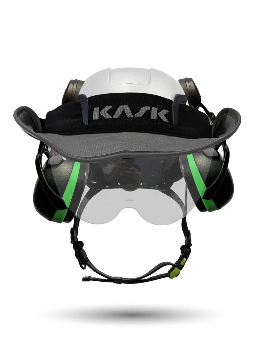 White Kask Zenith X2 ANSI Class E Safety Helmet w/ Full-Face Shield & Brim Kit (Clear) & Green Ear Muffs (Low To Medium Noise Reduction - 23-25 Db) & 360-Degree Sun Shield (Yellow Fluorescent)