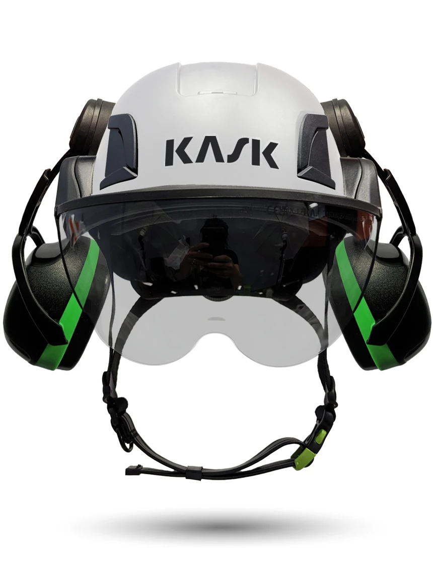White Kask Zenith X2 ANSI Class E Safety Helmet w/ Full-Face Visor Kit (Clear) & Green Ear Muffs (Low To Medium Noise Reduction - 23-25 Db)