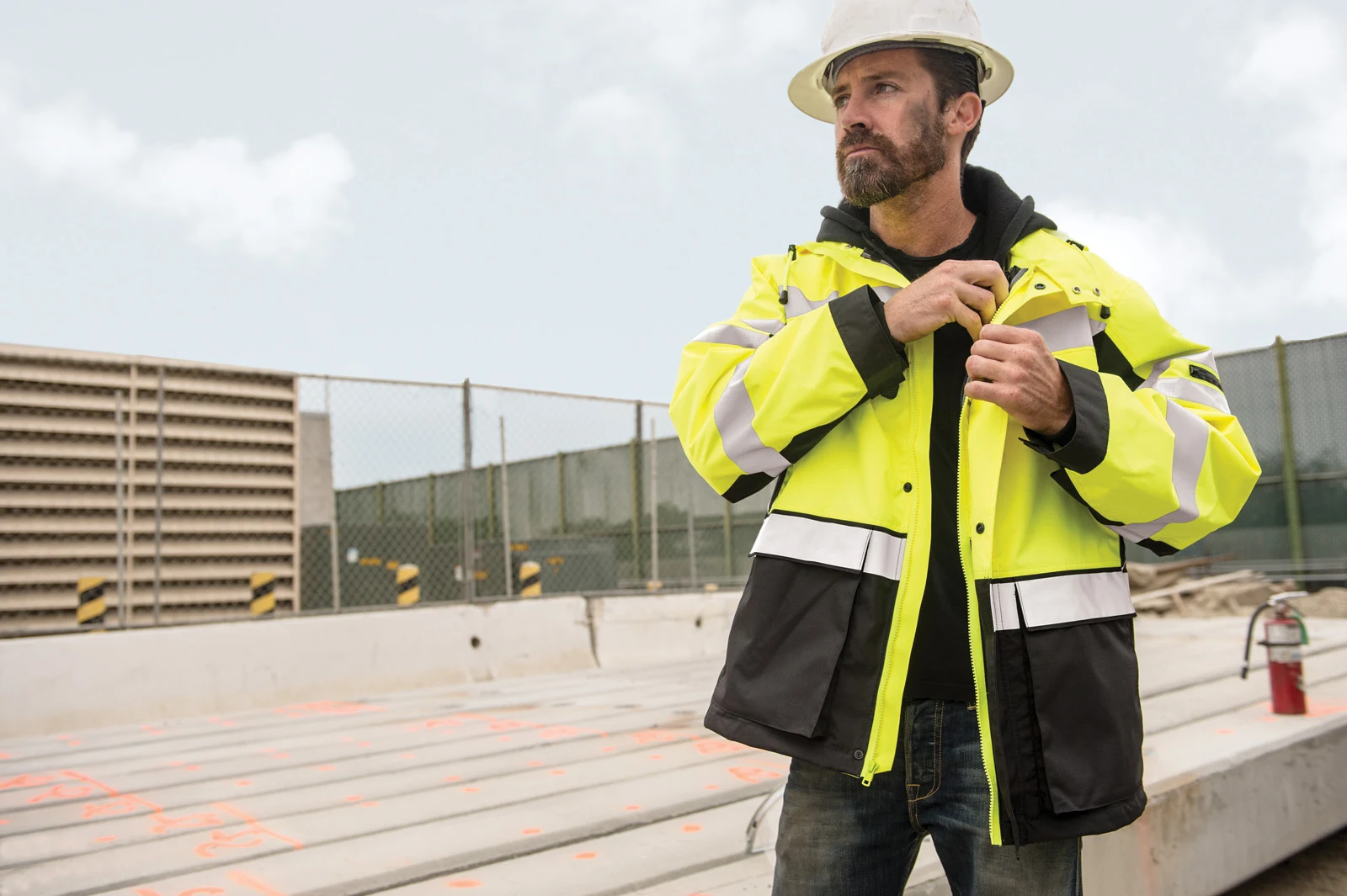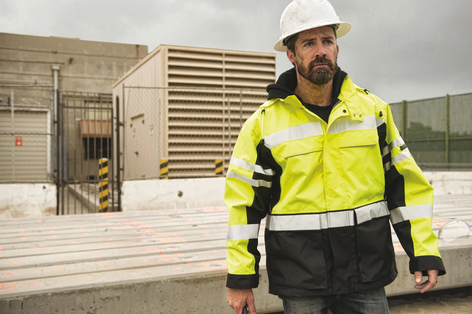- Practical jobsite features including multiple pockets, detachable hood, and rugged rip-stop construction.