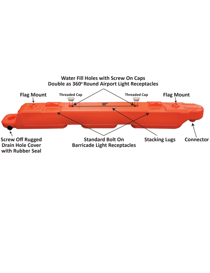 Each barricade holds up to 26 gallons of water, creating a stable and secure barrier that resists shifting from wind or passing equipment — while remaining easy to move when empty. - Interlocking, Pivoting Connections