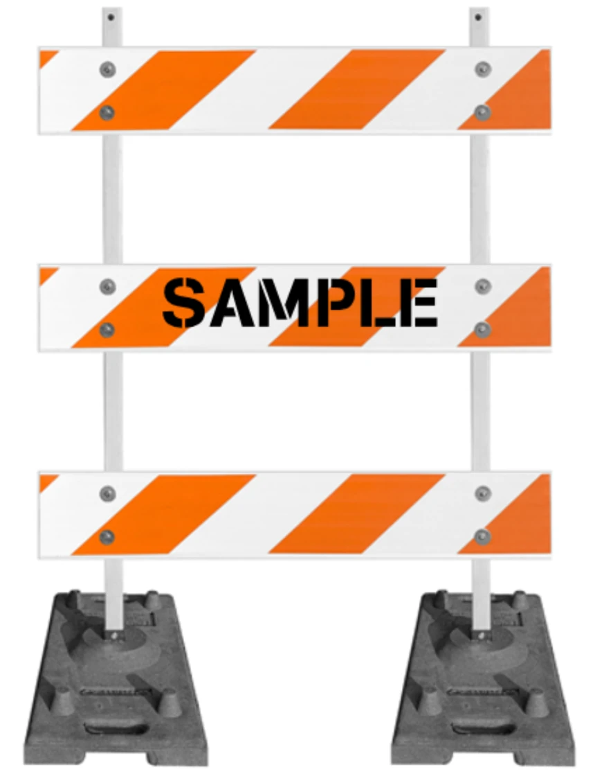 63" Tall MUTCD Type III Barricade -Plastic Power Post Uprights, Rubber Ballast Feet & Three 4' Plastic Boards w/HI Sheeting On Both Sides Of Rails & Custom Lettering