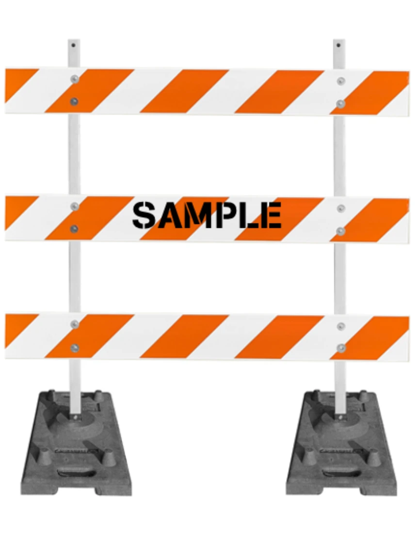 63" Tall MUTCD Type III Barricade -Plastic Power Post Uprights, Rubber Ballast Feet & Three 6' Plastic Boards w/HI Sheeting & Custom Lettering