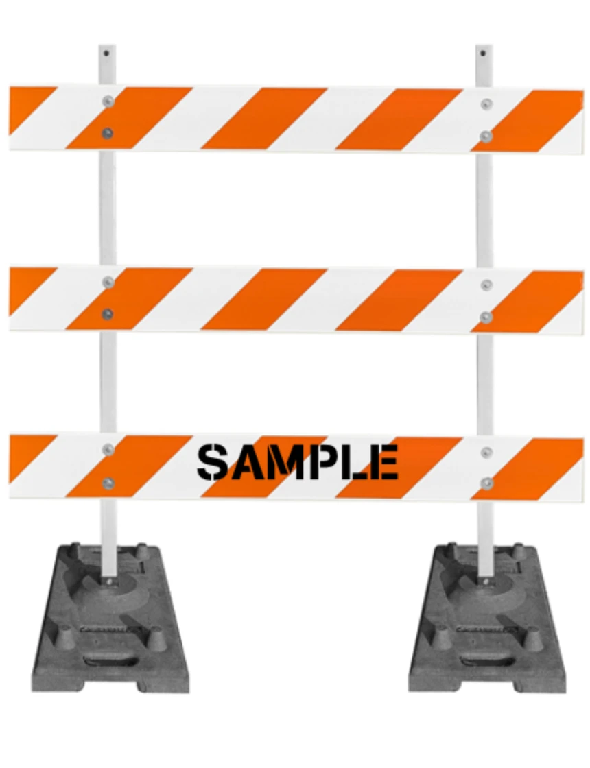 63" Tall MUTCD Type III Barricade -Plastic Power Post Uprights, Rubber Ballast Feet & Three 8' Plastic Boards w/EG Sheeting & Custom Lettering