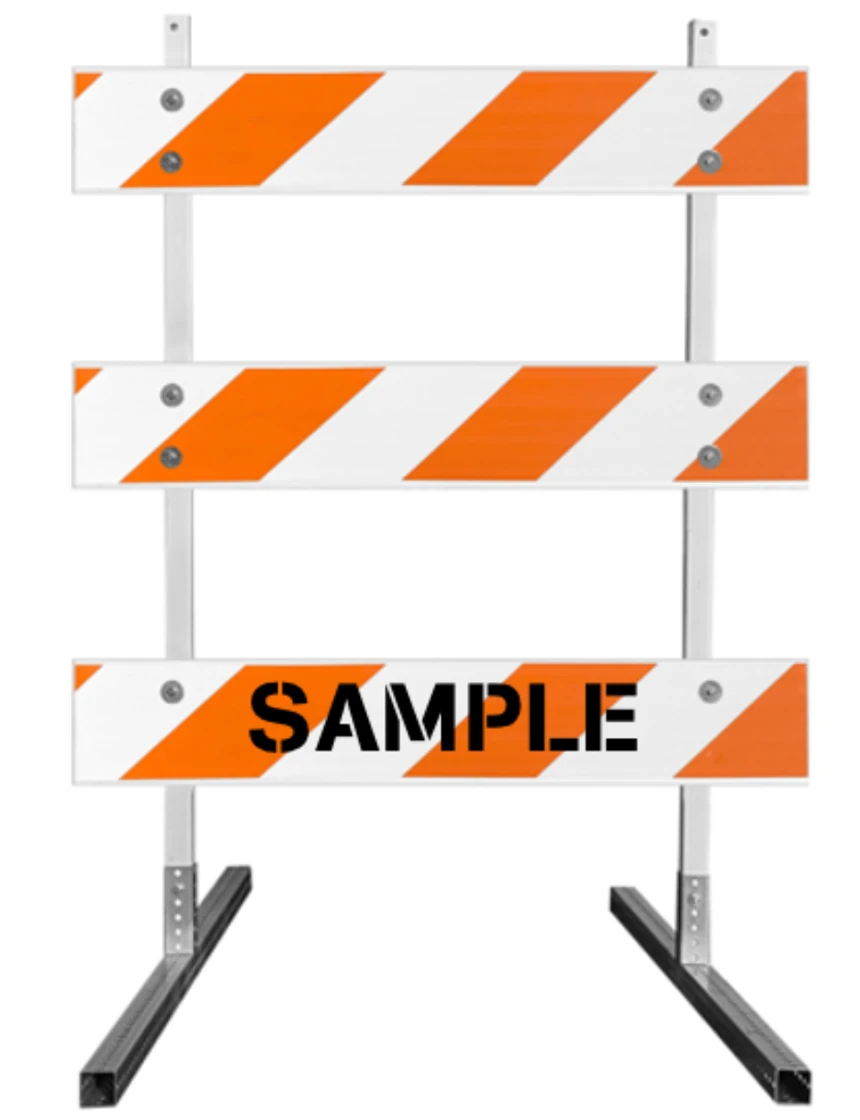 63" Tall MUTCD Type III Barricade -Plastic Power Post Uprights, Square Steel Sign Post Feet & Three 4' Plastic Boards w/EG Sheeting & Custom Lettering